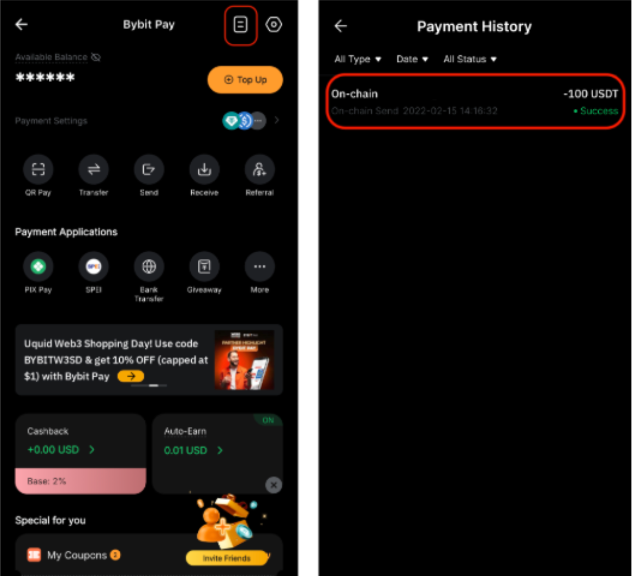 Buka halaman Bybit Pay dan ketuk ikon Riwayat Pembayaran di sudut kanan atas.