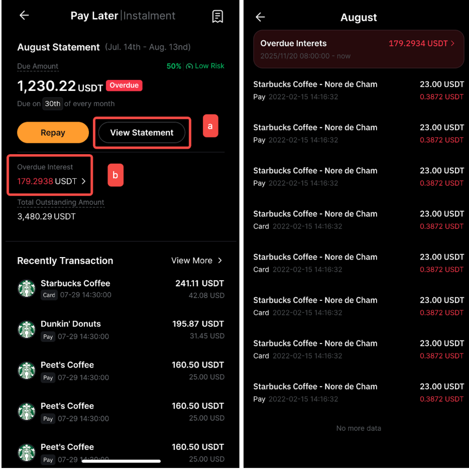 Dengan mengetuk Cicilan pada halaman Bybit Pay Later → (a) Lihat Pernyataan atau (b) Bunga Jatuh Tempo, Anda dapat melihat bunga jatuh tempo dan setiap rinciannya.