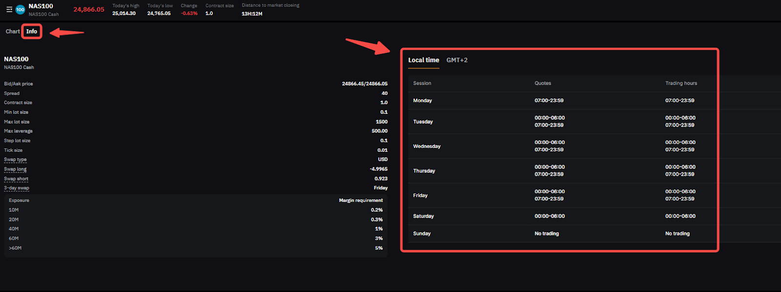 Untuk memeriksa jam perdagangan, cukup memilih simbol perdagangan yang Anda inginkan di TradFi guna membuka halaman perdagangannya. Anda dapat melihat jam perdagangan untuk simbol spesifik tersebut dengan mengeklik label Info.