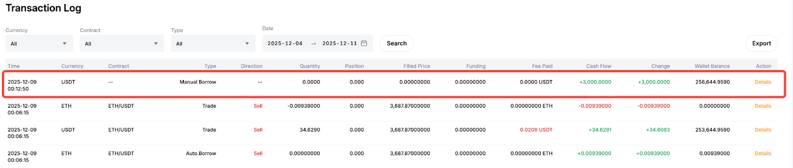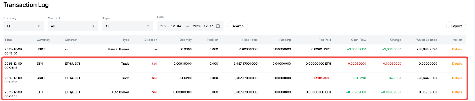 Menunjukkan bahwa sistem secara otomatis meminjam ETH untuk menyelesaikan pesanan Jual. Harga yang dipinjam ETH (harga jual dari pesanan Margin Spot terkait) dicatat, dan transaksi muncul sebagai arus kas positif.