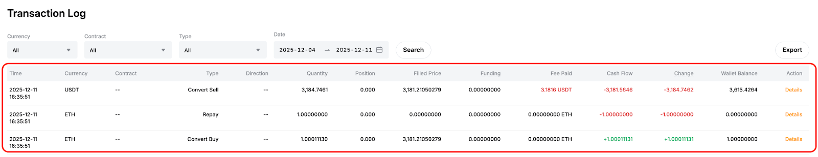 Menunjukkan jumlah USDT dan harga penuh yang digunakan untuk dikonversi ke ETH untuk pelunasan. Biaya konversi dicatat, dan Saldo Dompet mencerminkan pengurangan USDT.