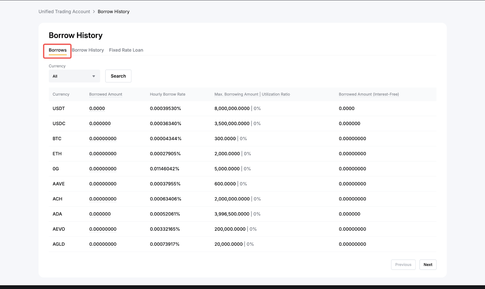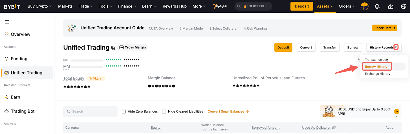 Atau, silakan menuju ke Akun Perdagangan Terpadu → Catatan Riwayat → Riwayat Peminjaman. Di sana, Anda akan dapat melihat suku bunga per jam dan detail pinjaman Anda.