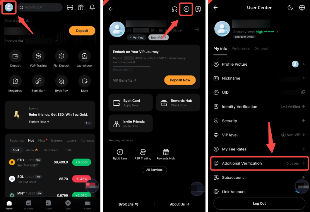 Masuk ke Aplikasi Bybit dan buka ikon Profil → Pengaturan → Verifikasi Tambahan.