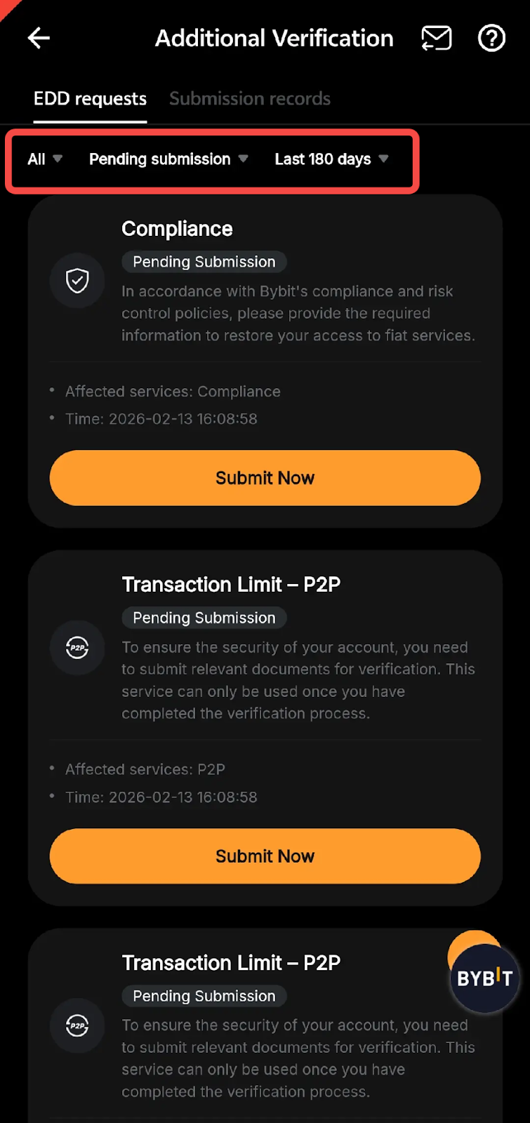– Saat ini, permintaan EDD dapat dibatalkan untuk deposit, penarikan, transfer lintas wilayah, pembelian atau penjualan kripto dengan fiat, pengajuan Kartu Bybit, dan skenario lain yang tercakup dalam Travel Rule.