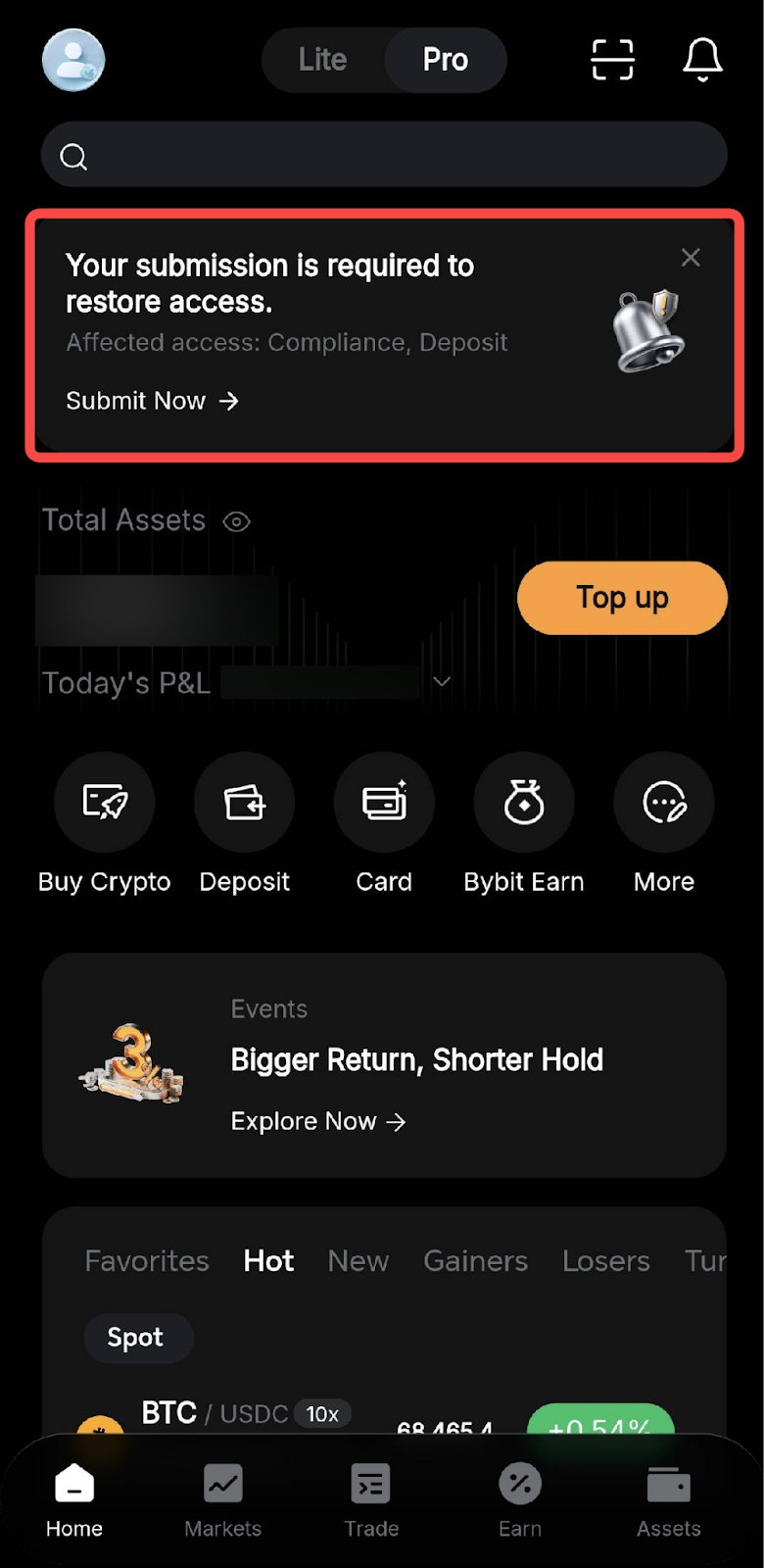 Langkah 1: Masuk ke Aplikasi Bybit. Perintah pengajuan akan muncul di bagian atas halaman Beranda jika EDD diwajibkan.