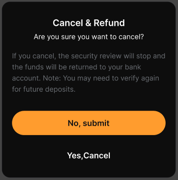 – Anda hanya dapat membatalkan transaksi ketika status EDD-nya adalah Tindakan Diperlukan. Jika statusnya adalah Sedang Ditinjau atau Ditolak, pembatalan tidak tersedia dan Anda perlu mengajukan informasi yang diperlukan untuk menyelesaikan verifikasi.