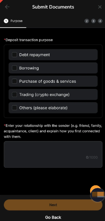 - Sumber Dana (SOF) dan/atau Sumber Kekayaan (SOW). Untuk informasi selengkapnya tentang persyaratan SOF atau SOW, silakan merujuk ke artikel ini.