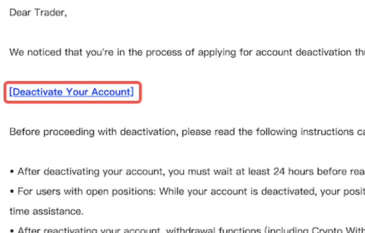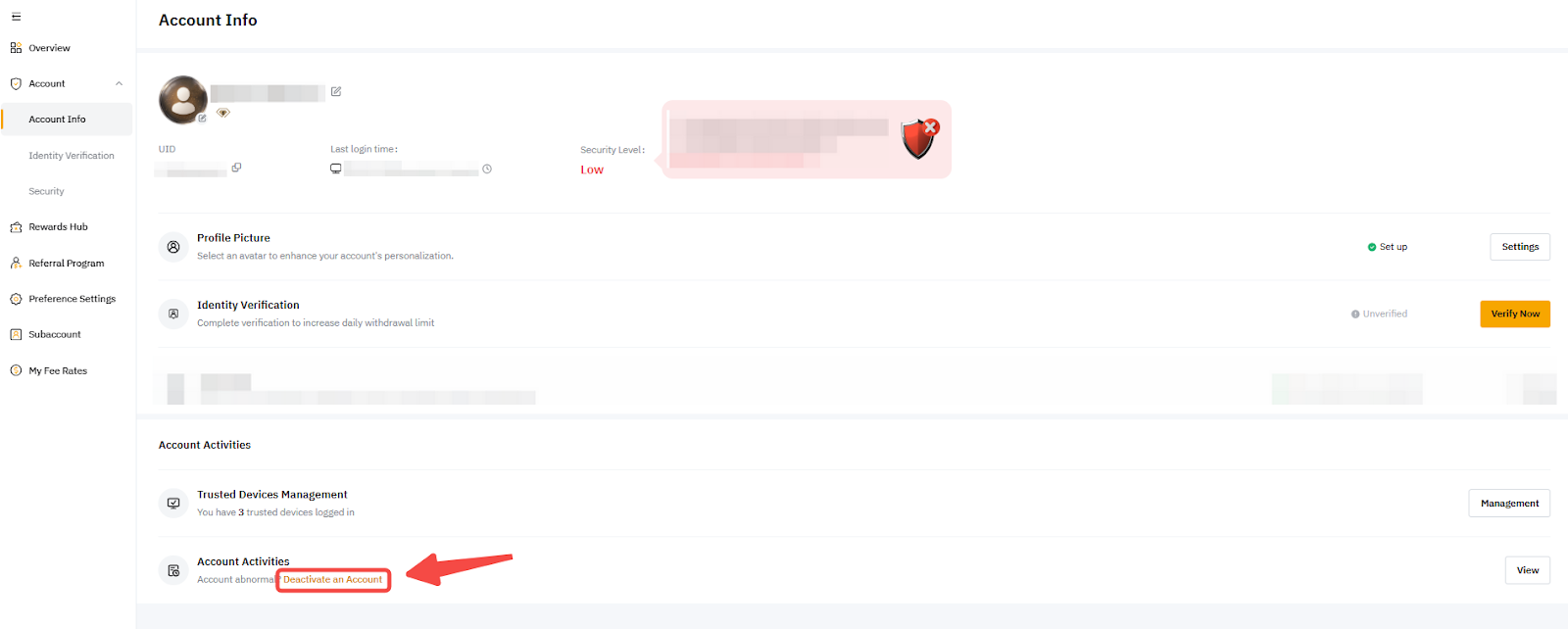 Bybit telah meluncurkan fitur penonaktifan akun layanan mandiri, yang memungkinkan pengguna untuk menonaktifkan akun mereka sendiri melalui laman Akun, alih-alih mengirimkan permintaan penonaktifan akun ke dukungan pelanggan Bybit.