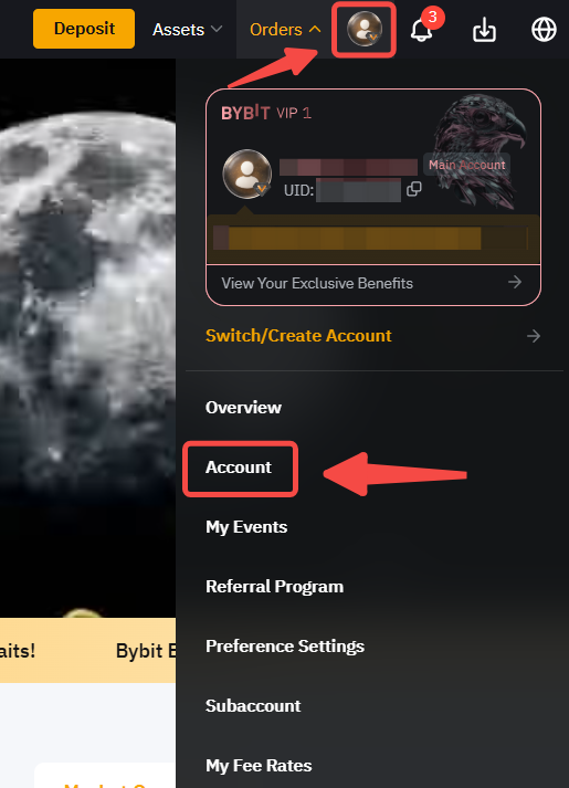 Langkah 1: Masuk ke akun Bybit Anda dan lanjutkan ke Akun dengan mengeklik ikon profil di sudut kanan atas pada laman Bybit.