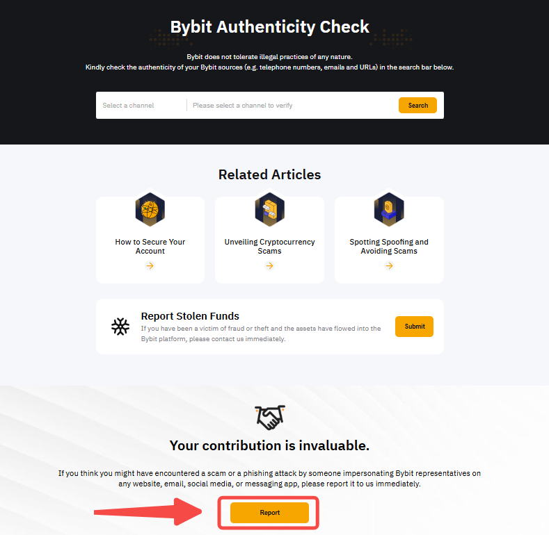 Jika Anda telah mengaktifkan kode anti-phishing untuk akun Anda, tetapi kode tersebut hilang atau salah, email atau SMS mungkin merupakan upaya penipuan. Dalam kasus tersebut, jangan mengeklik tautan apa pun atau mengambil tindakan yang ditunjukkan dalam pesan. Laporkan ke Bybit dengan mengeklik Laporan pada halaman ini.