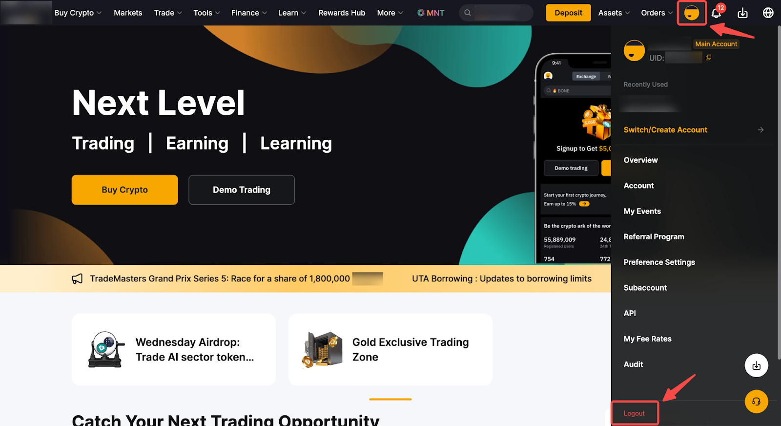 Untuk keluar dari akun Bybit Anda melalui aplikasi, Anda dapat masuk ke Pusat Pengguna, lalu klik tab Keluar. Untuk situs web, Anda dapat mengeklik ikon profil di sudut kanan atas (langkah 1) lalu mengeklik tab Keluar (langkah 2).