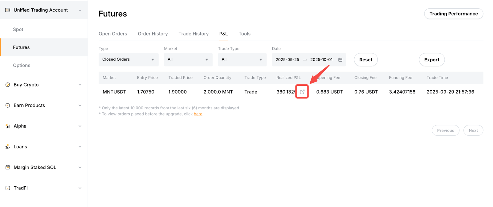 Langkah 3: Pilih perdagangan Futures yang relevan dari panel samping, dan beralih ke tab L&R untuk menemukan L&R tertutup yang ingin Anda bagikan.