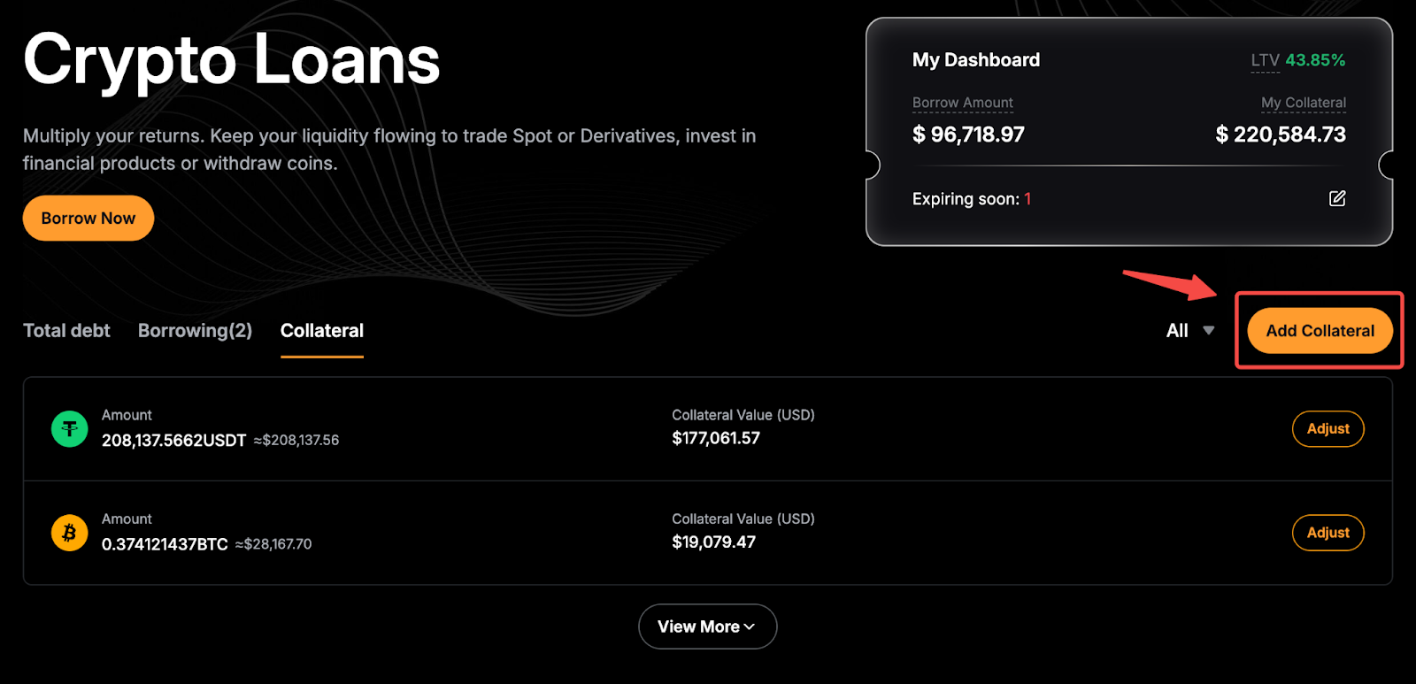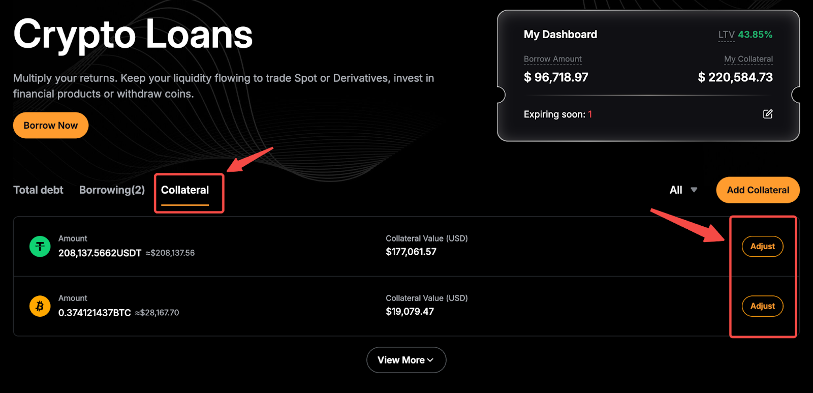 - Jaminan — Mencantumkan semua aset jaminan beserta jumlah dan nilai USD-nya. Anda dapat mengklik Sesuaikan untuk mengubah jaminan Anda.