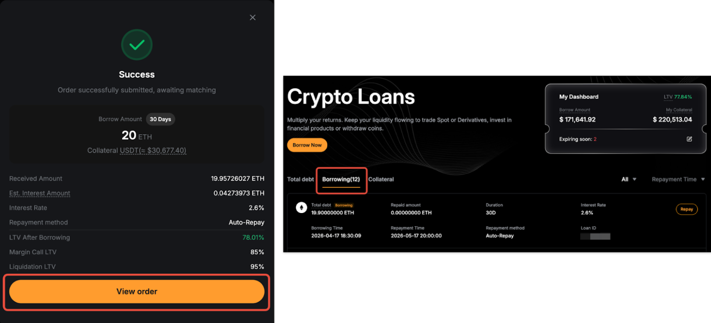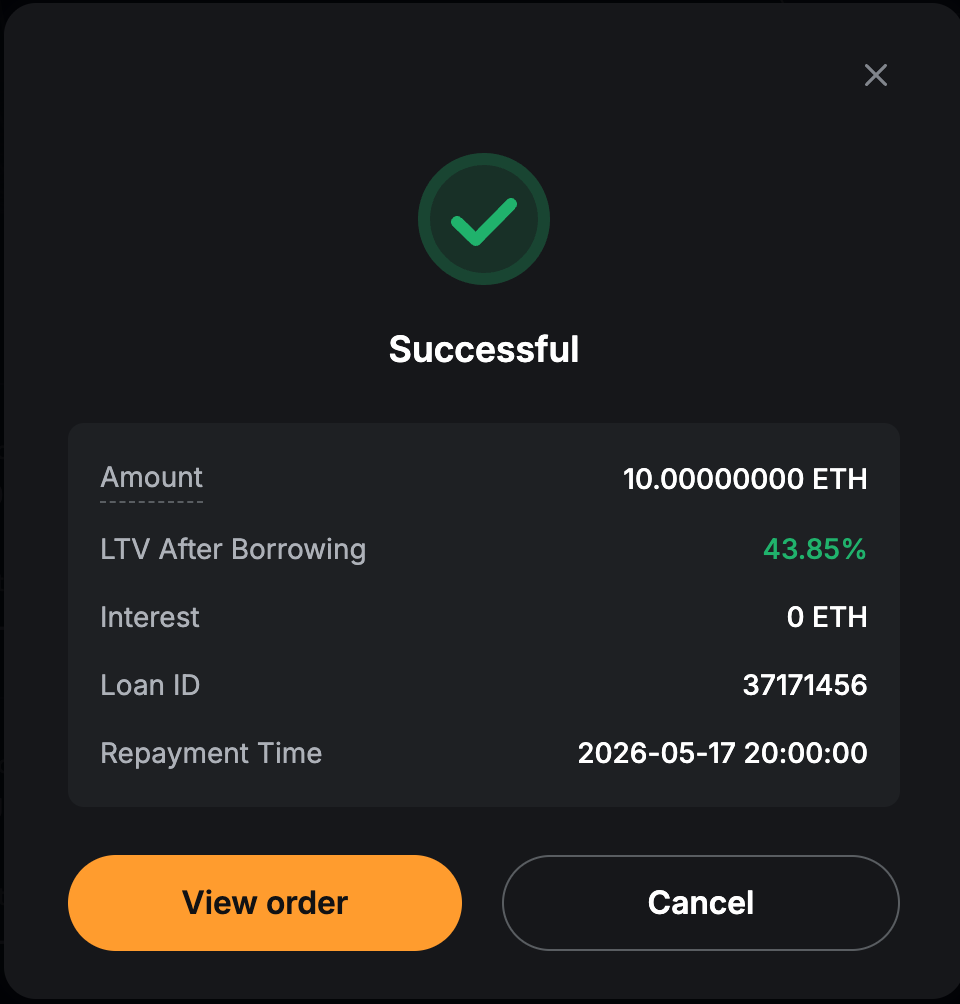 Langkah 3: Permintaan pinjaman Anda telah berhasil diajukan. Klik Lihat Pesanan untuk menuju dasbor Pinjaman Kripto , di mana Anda dapat memeriksa Status pesanan pinjaman Anda.