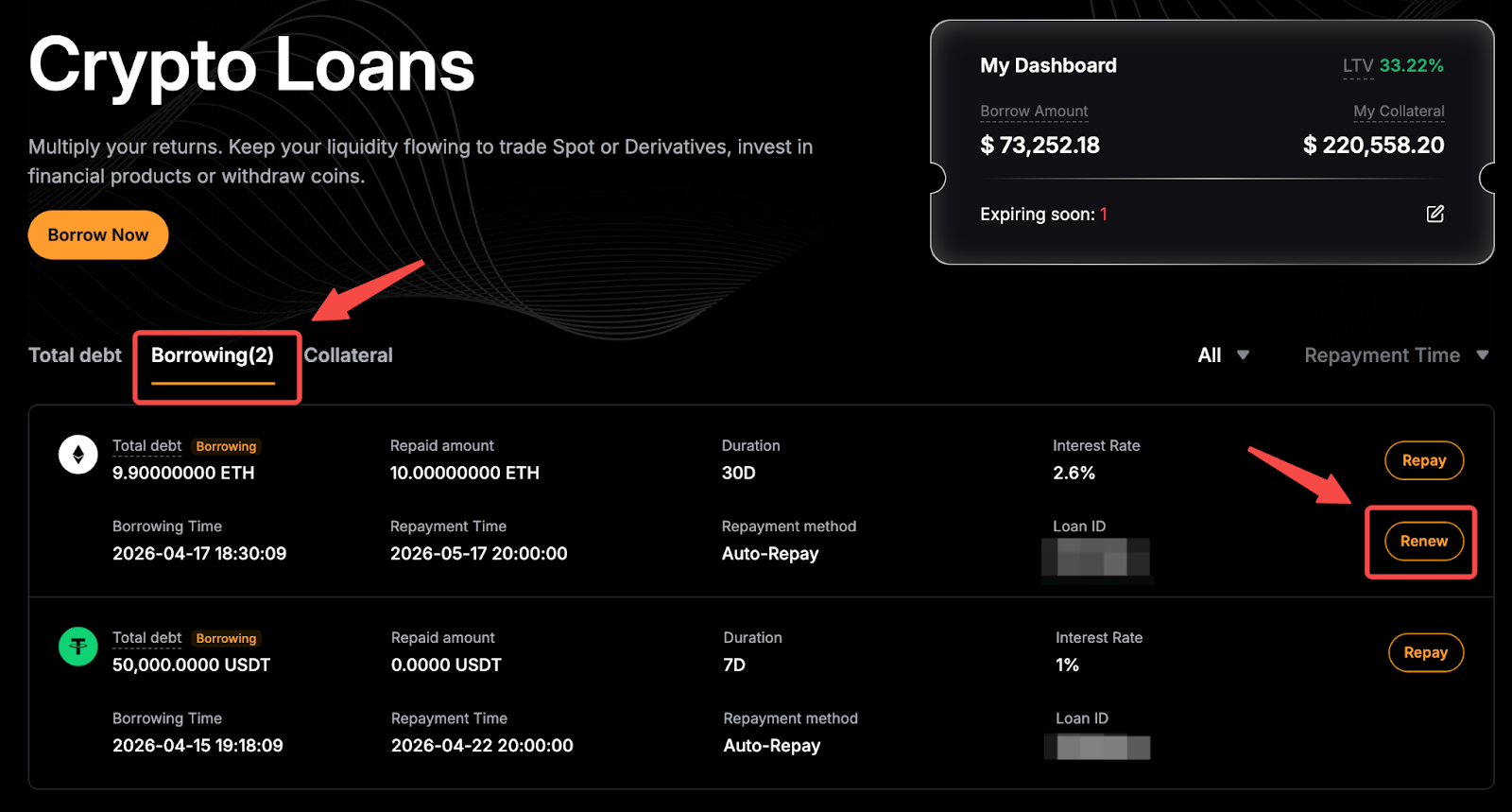 Langkah 2: Atur jaminan Anda untuk pinjaman perpanjangan, lalu tinjau LTV dan tanggal jatuh tempo pelunasan. Klik Perbarui untuk mengonfirmasi.