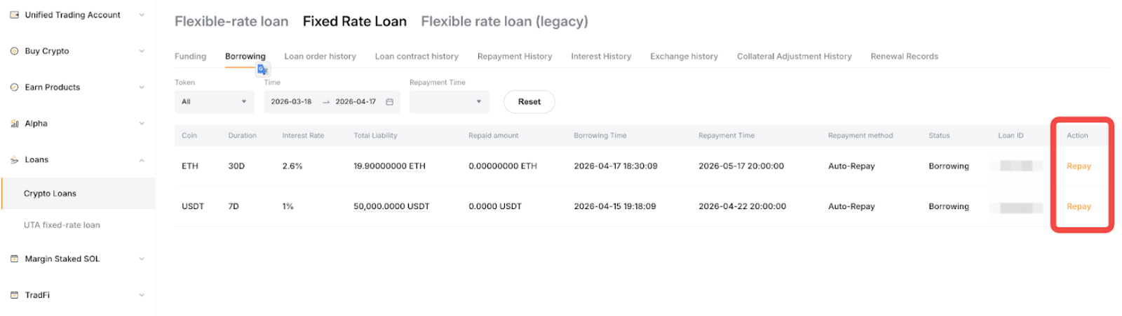 Untuk melihat daftar lengkap pesanan Anda, klik Pesanan pinjaman di Dasbor Ikhtisar. Anda dapat menelusuri semua pesanan Pinjaman Kripto dengan berpindah antar tab produk di bagian atas, termasuk Pinjaman dengan Suku Bunga Fleksibel dan Pinjaman dengan Suku Bunga Tetap (dengan Pinjaman Premier yang dikategorikan dalam Pinjaman dengan Suku Bunga Tetap). Setiap pesanan mencakup informasi mendetail seperti jumlah pinjaman, pelunasan, bunga, agunan, dan banyak lagi. Anda juga dapat menggunakan fitur Filter Berdasarkan aset atau waktu untuk mempersempit hasil.