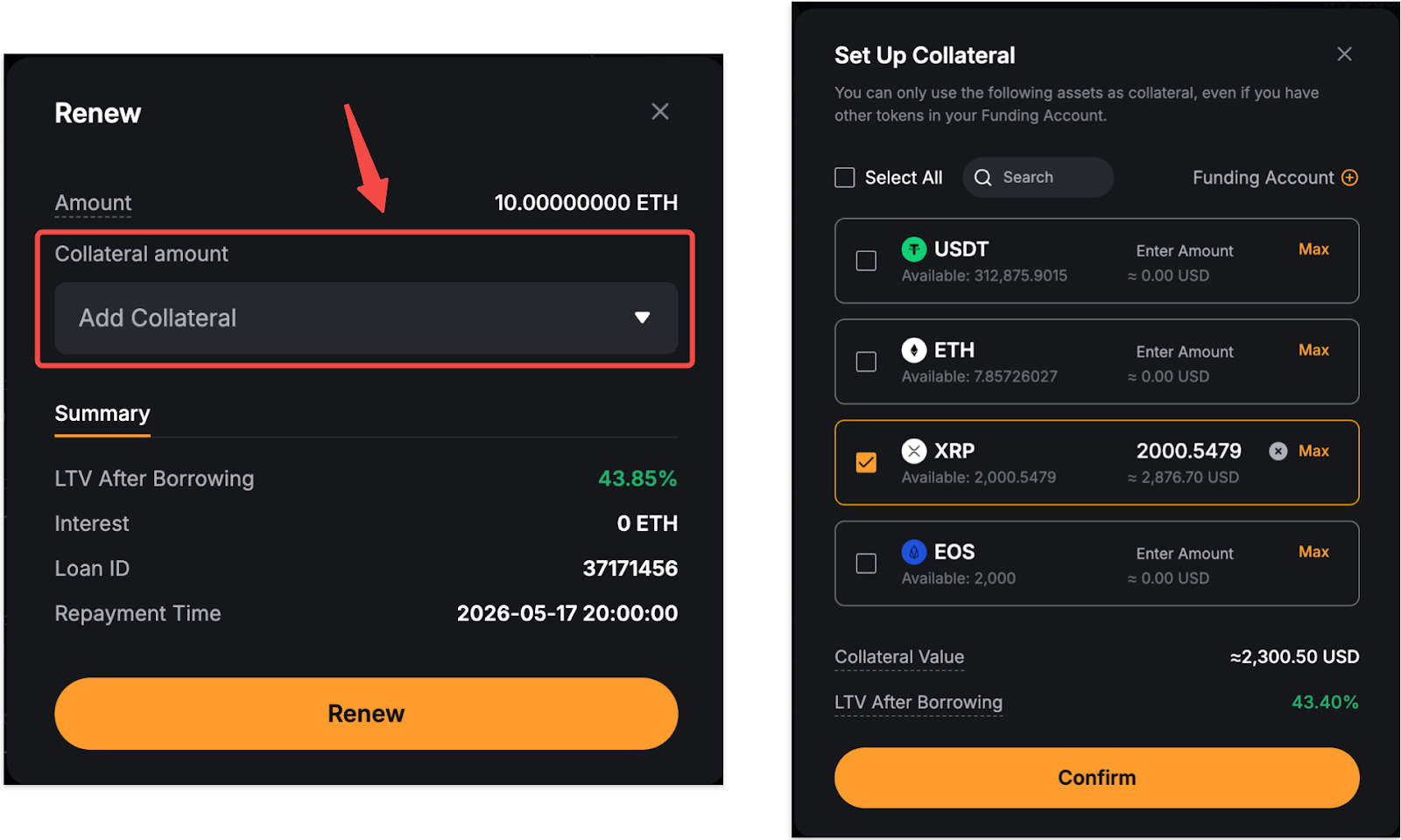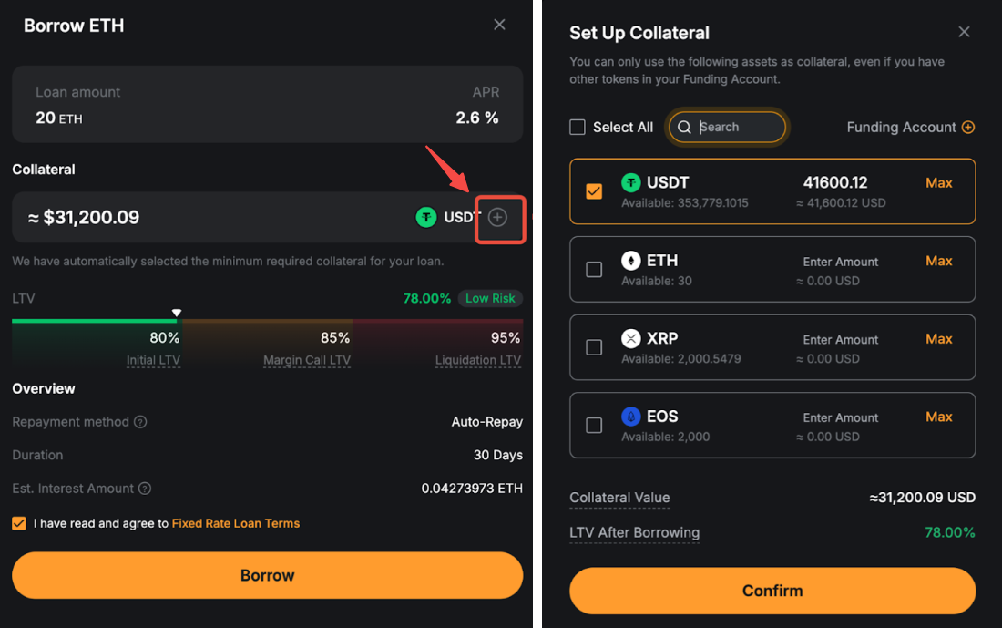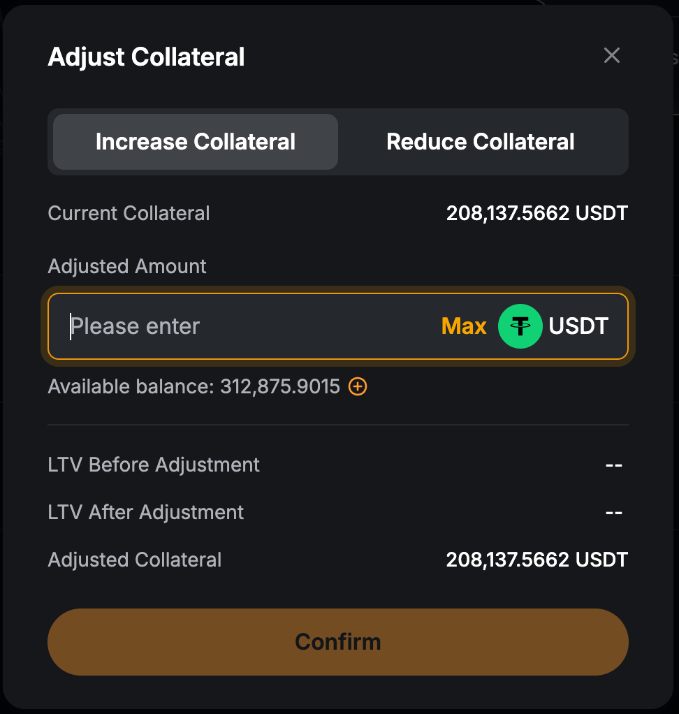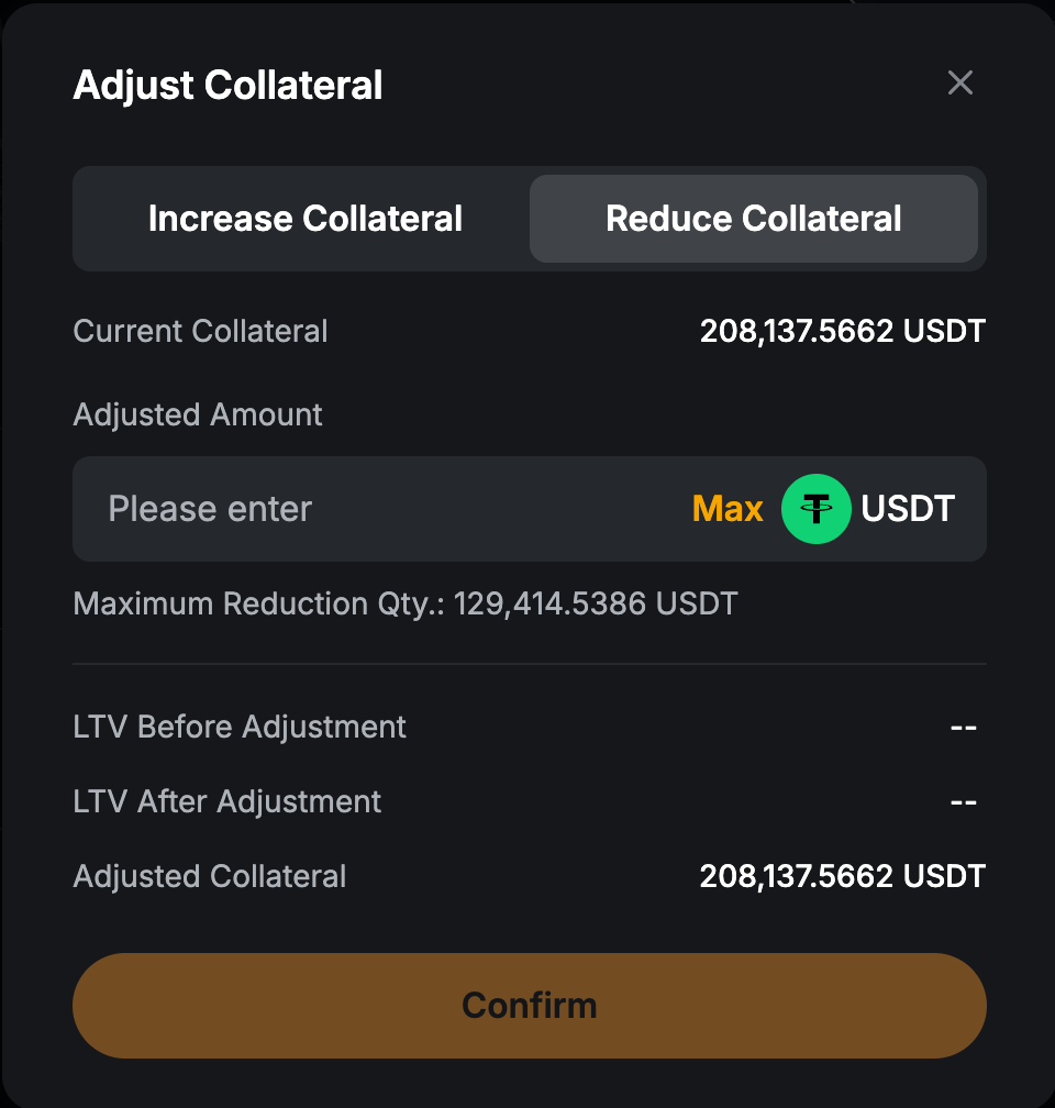 Jika Anda ingin mengubah aset agunan atau menambahkan lebih banyak agunan, klik ikon "+" di bagian agunan. Lakukan penyesuaian Anda, lalu klik Konfirmasi untuk menerapkan perubahan. Anda juga dapat menyesuaikan agunan Anda kapan saja dari dasbor Pinjaman Kripto.