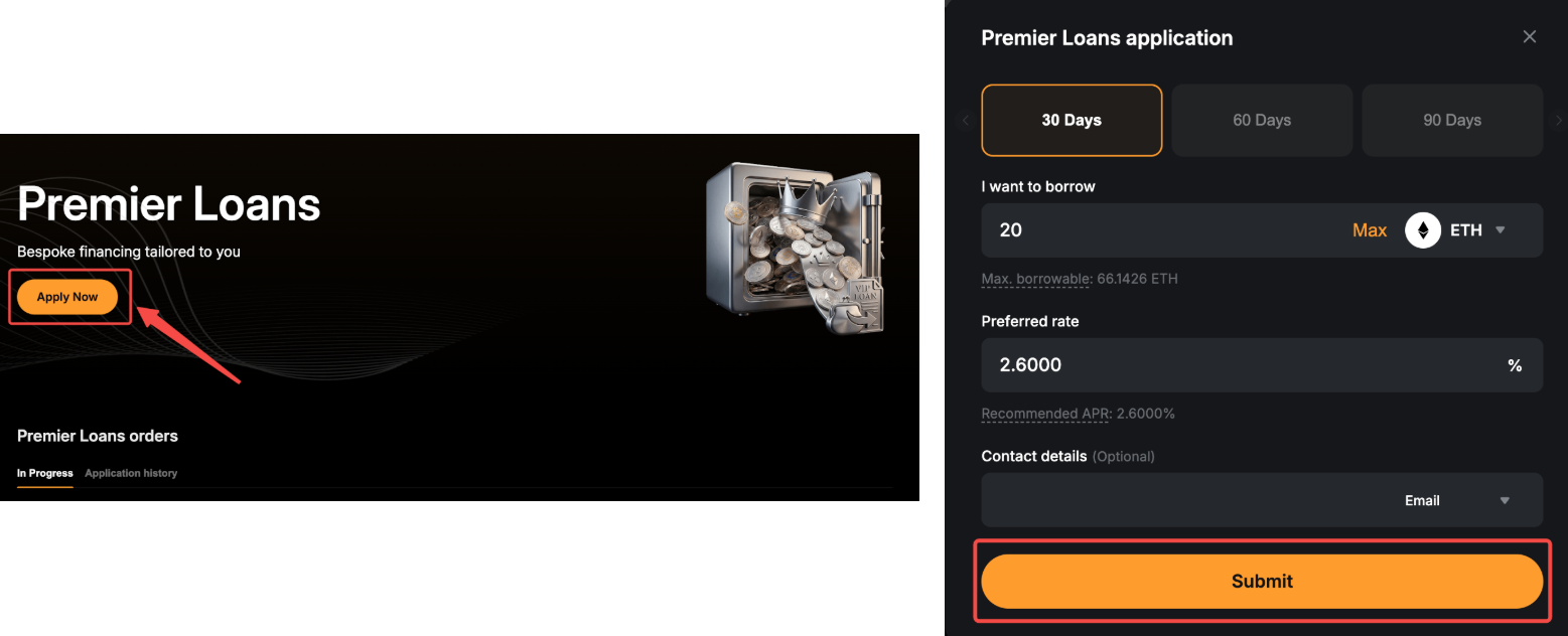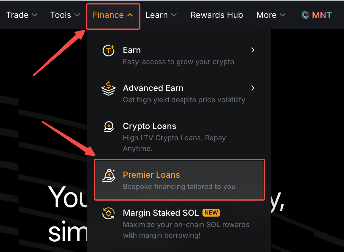 Langkah 1: Masuk ke situs web Bybit dan klik Keuangan → Premier Loans di bilah navigasi Atas untuk mengakses halaman Premier Loans.