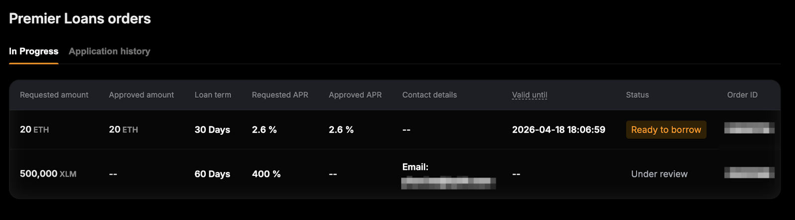 - Sedang Berlangsung: Tab ini menampilkan pengajuan yang berstatus Dalam peninjauan atau Siap untuk meminjam. Setiap pengajuan menunjukkan detail utama, termasuk jumlah pinjaman, durasi, APR, dan informasi kontak yang dikirimkan. Untuk pengajuan dengan Status Siap untuk meminjam, detail tambahan seperti jumlah yang disetujui, APR yang disetujui, dan tanggal kedaluwarsa juga akan ditampilkan.