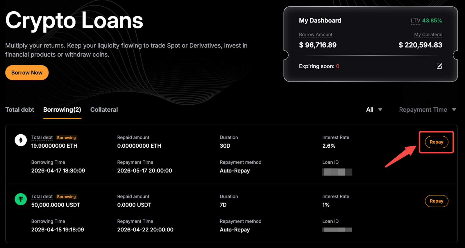 Jika Anda memilih untuk melunasi pinjaman menggunakan aset kolateral, biaya pelunasan akan berlaku. Tarif biaya yang dikenakan adalah yang lebih tinggi antara tarif biaya pelunasan untuk aset kolateral dan aset yang dipinjam. Nilai kolateral yang digunakan untuk pelunasan ditentukan oleh tingkat konversi kolateral, yang didasarkan pada harga indeks dari kedua aset tersebut.