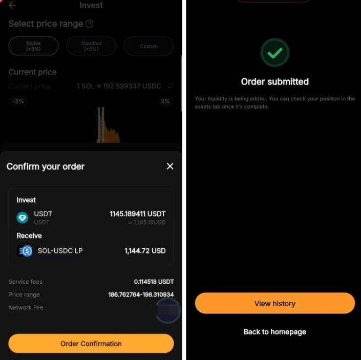 Langkah 5: Pada jendela konfirmasi, tinjau detail pesanan dan konfirmasi pesanan Anda. Dana Anda kemudian akan mulai berkontribusi dalam pool likuiditas.