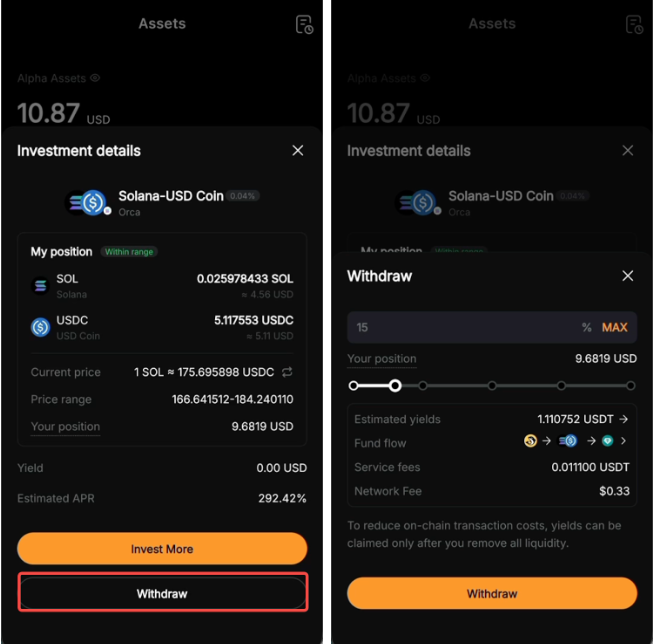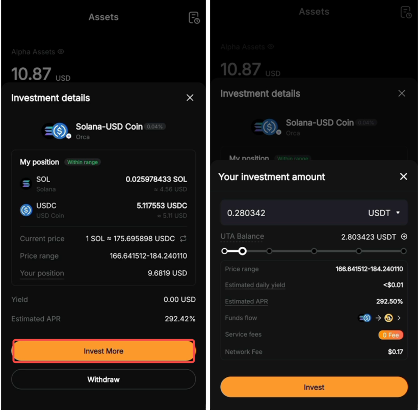 Langkah 2: Ketuk Investasikan Lebih Banyak untuk menambahkan lebih banyak dana ke posisi Anda saat ini dalam pool likuiditas tersebut dan berpotensi meningkatkan hadiah Anda. Masukkan jumlah yang diinginkan, lalu ketuk Investasi untuk menyelesaikan proses.