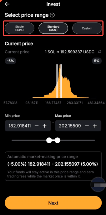 Langkah 3: Pilih rentang harga Anda — ini menentukan rentang yang akan digunakan secara aktif untuk likuiditas Anda. LP CLMM menawarkan tiga opsi: