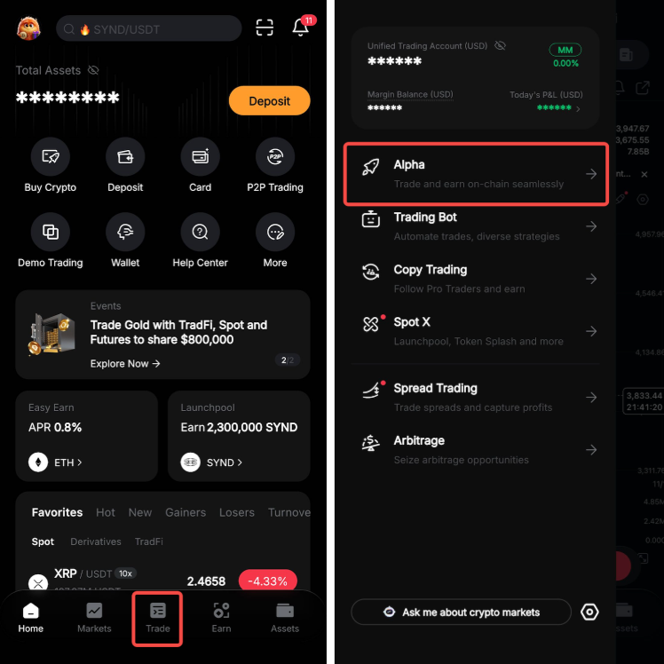 a. Ketuk Trade di bilah bawah. Kemudian, ketuk ikon menu di sudut kiri atas dan pilih Alpha.