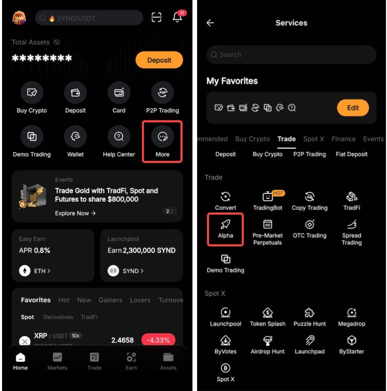 b. Ketuk Selengkapnya di halaman Beranda dan pilih Alpha di bagian Trade.
