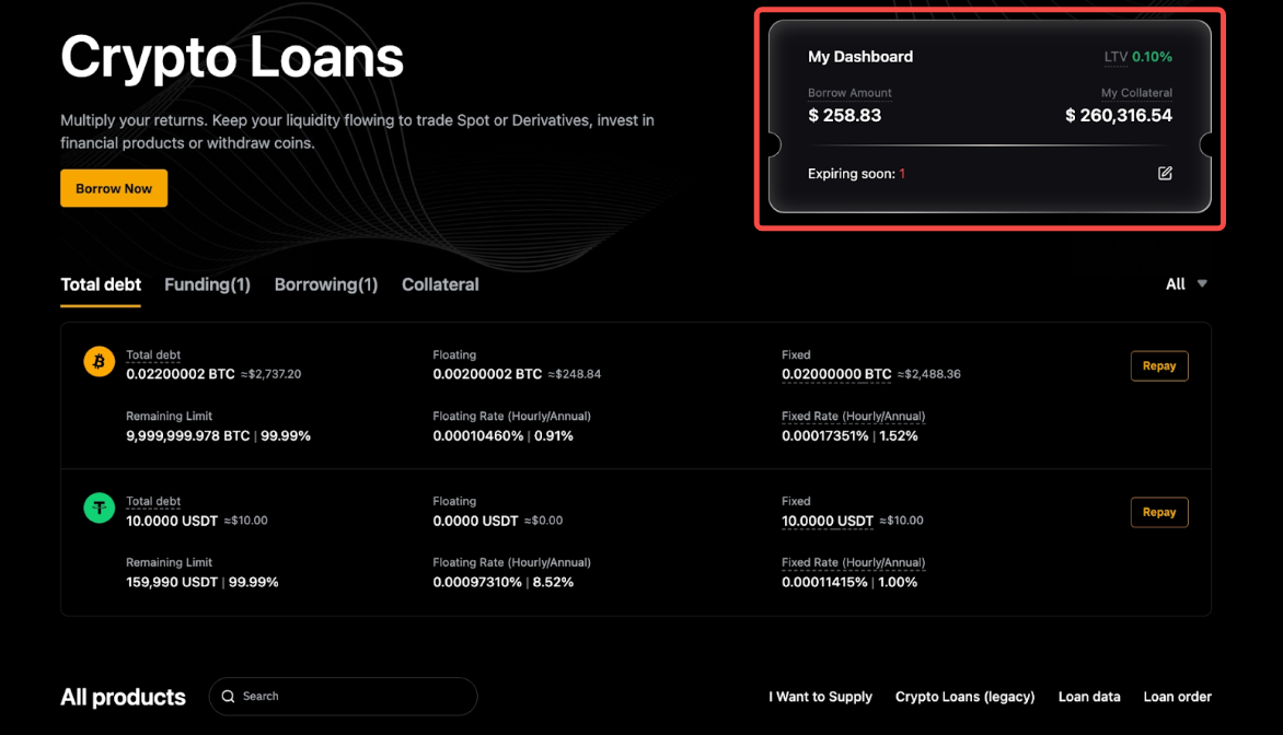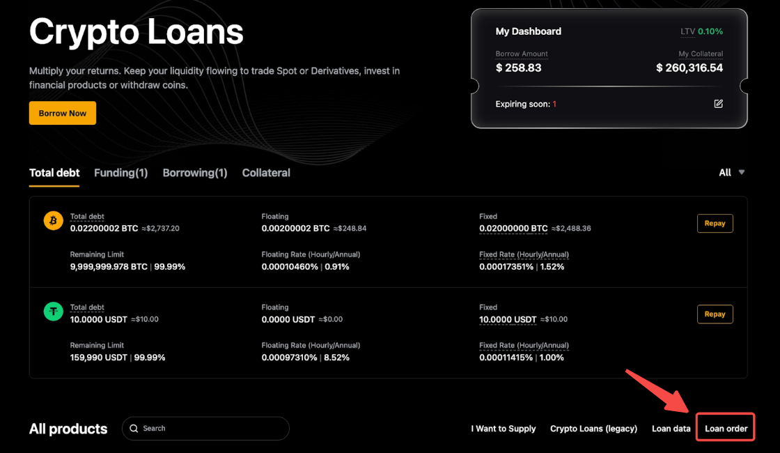 Untuk memeriksa pinjaman Anda, kunjungi beranda Pinjaman Kripto dan Anda akan melihat ikhtisar total pinjaman, jaminan, dan pesanan Anda.