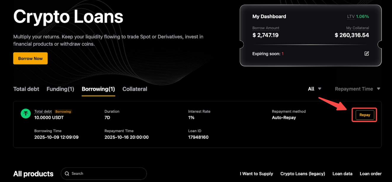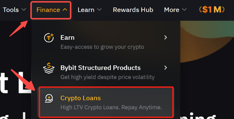 Langkah 1: Masuk ke situs web Bybit dan klik Keuangan → Pinjaman Kripto di bilah navigasi untuk mengakses laman Pinjaman Kripto.