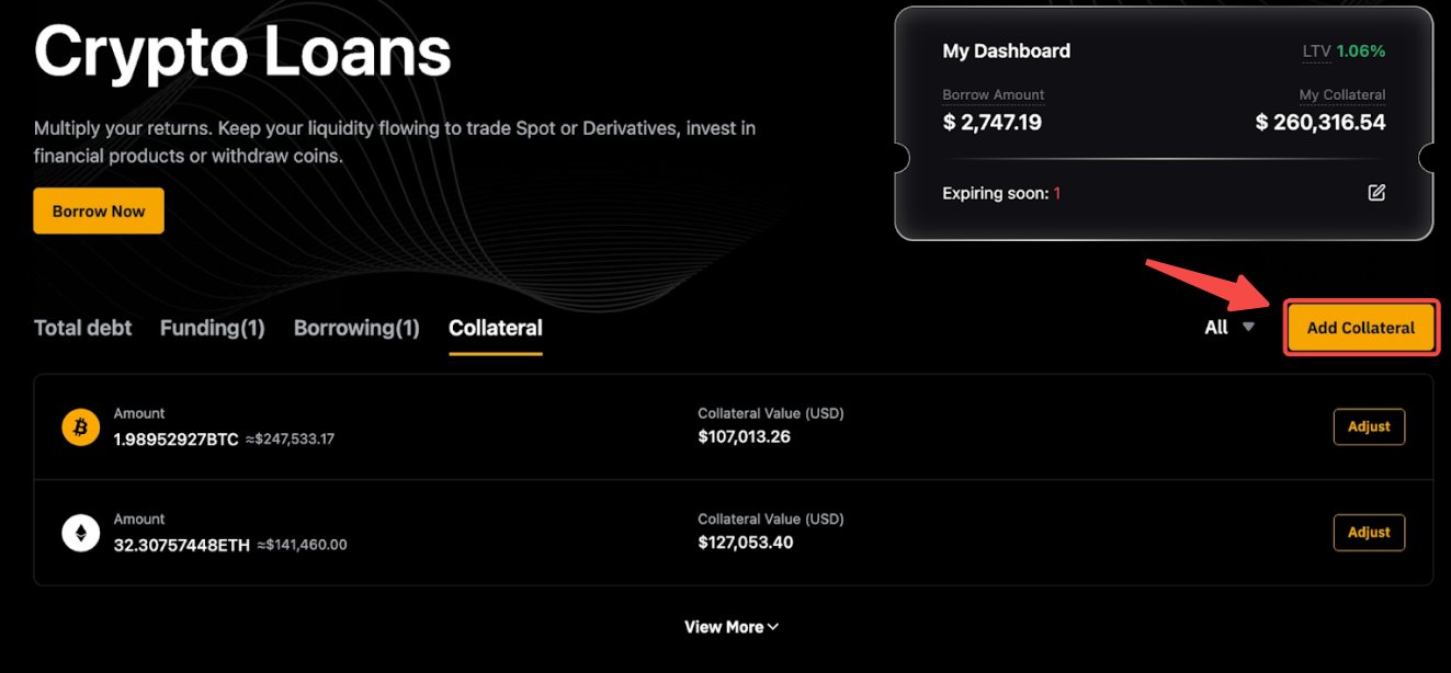 - Jaminan — Mencantumkan semua aset jaminan dengan kuantitas dan nilai USD-nya. Klik Sesuaikan untuk mengubah jaminan Anda.
