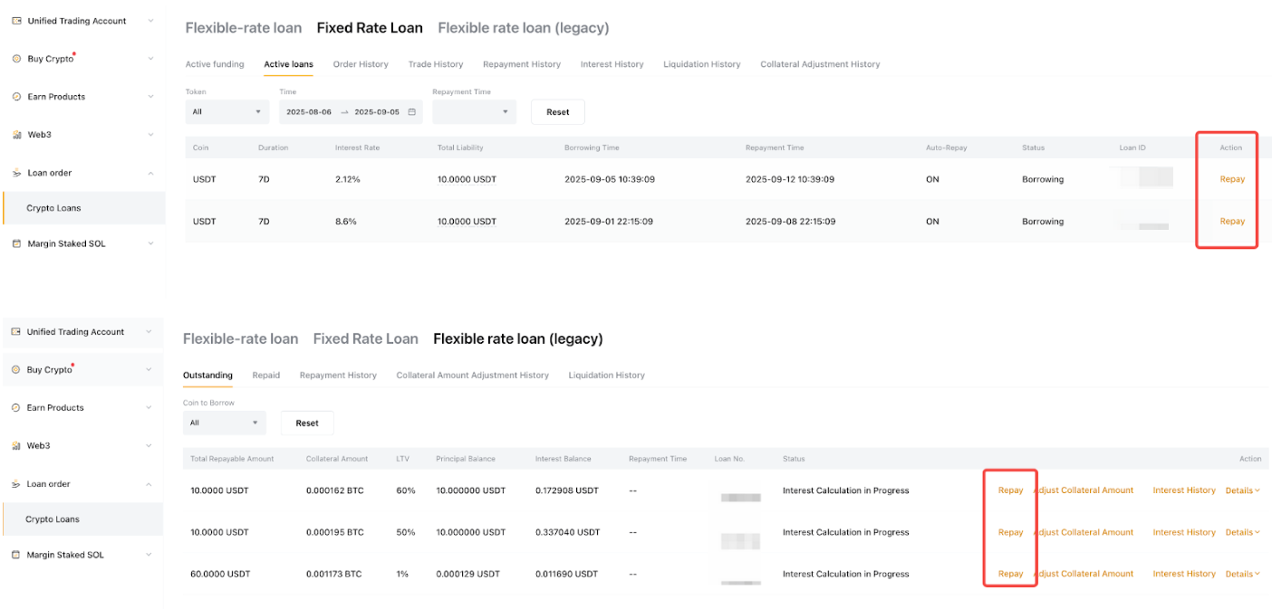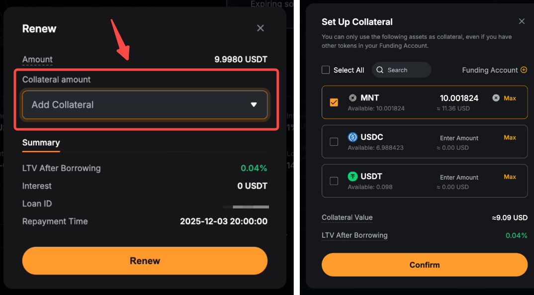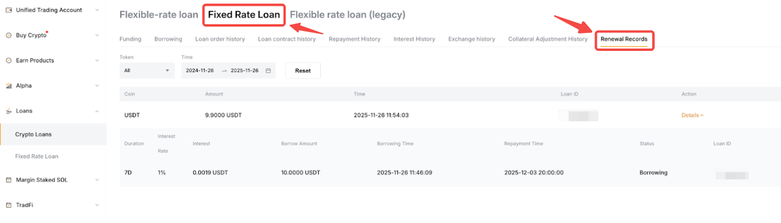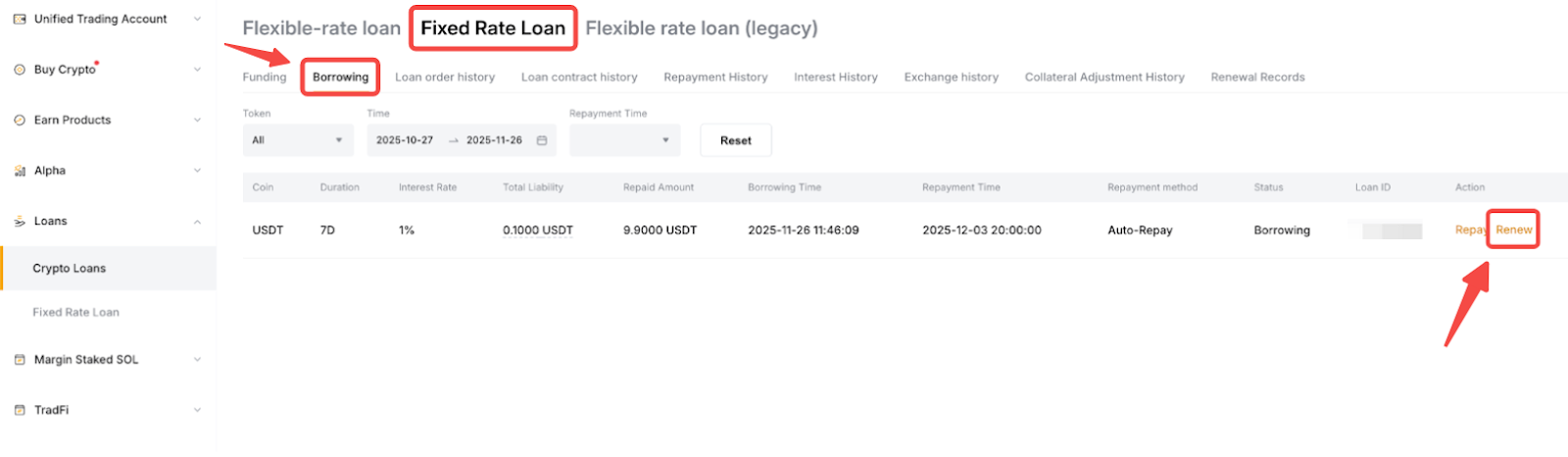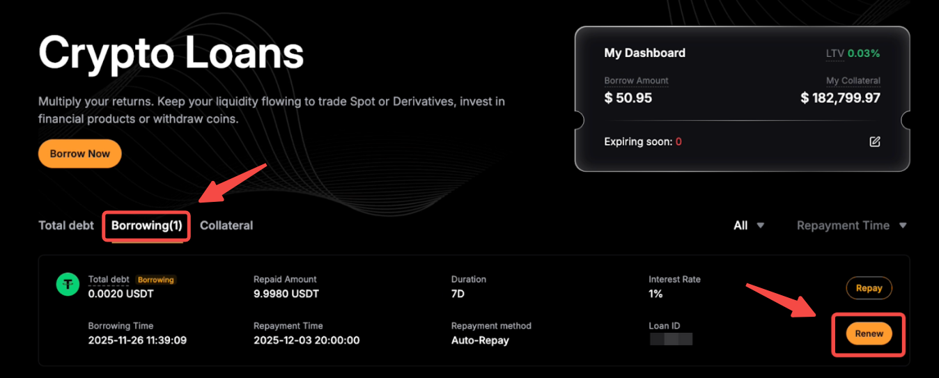 Fungsi Pembaruan Pinjaman hanya tersedia untuk pesanan yang telah dilunasi dengan jumlah lebih besar dari 0 dan lebih dari 6 jam sebelum tanggal jatuh tempo. Harap diperhatikan bahwa setiap kontrak pinjaman dapat diperbarui hingga 5 kali.