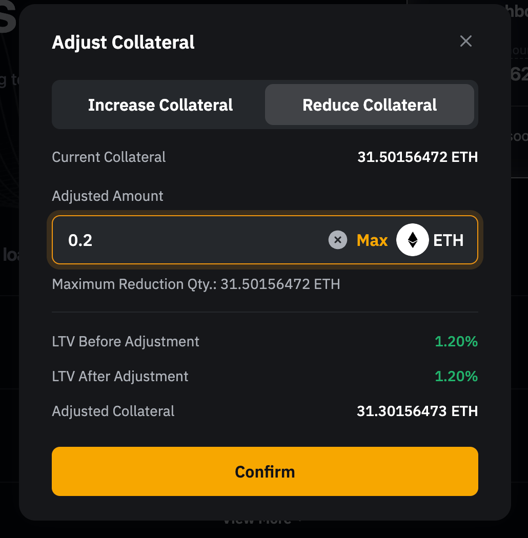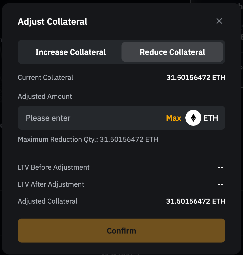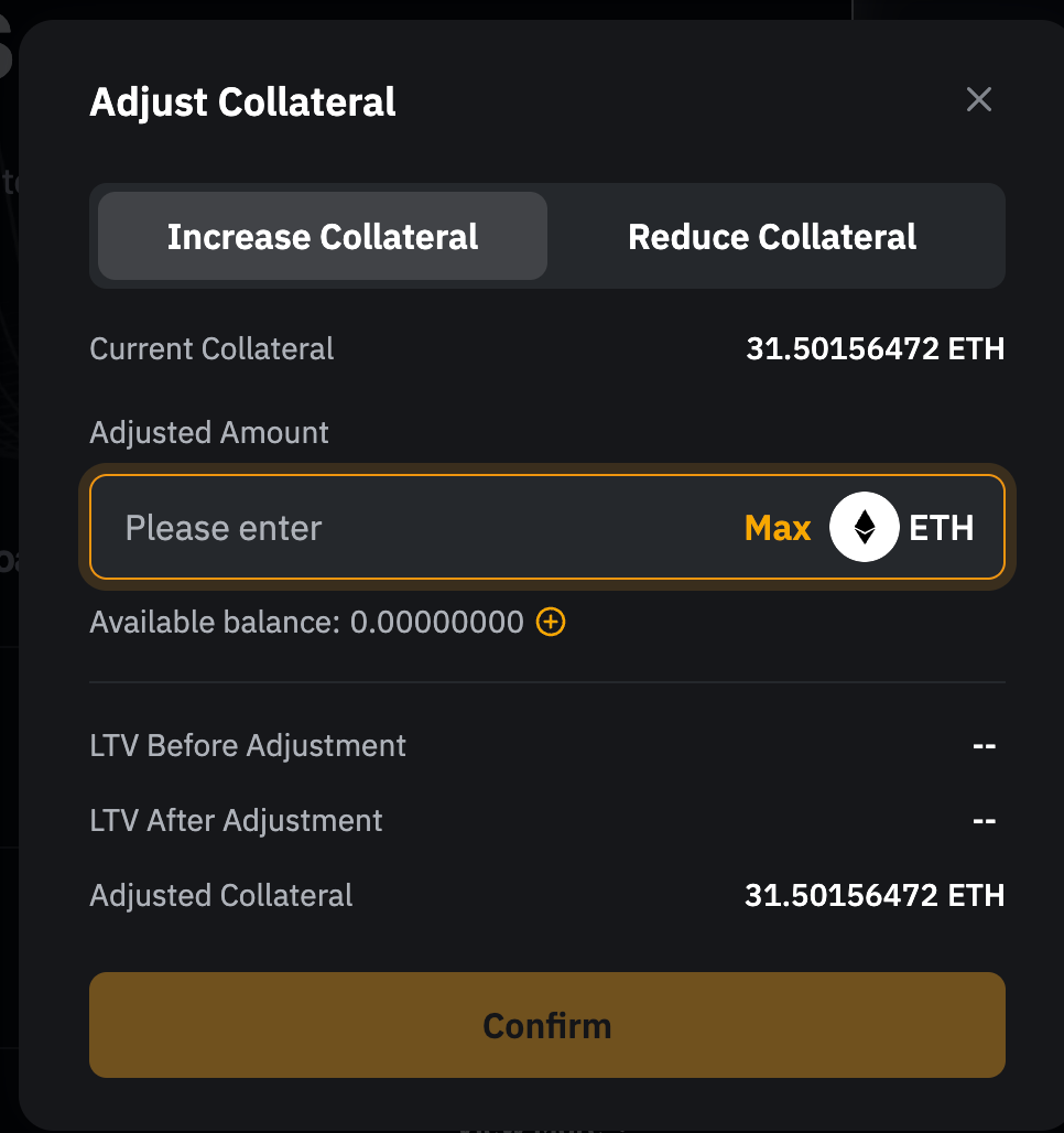 Langkah 2: Untuk menyesuaikan jumlah jaminan, buka tab Tingkatkan Jaminan. Masukkan jumlah yang ingin ditambahkan, atau klik Maksimum untuk menggunakan seluruh sisa saldo di Akun Pendanaan Anda. Menambahkan jaminan akan mengurangi LTV dan menurunkan risiko likuidasi Anda.