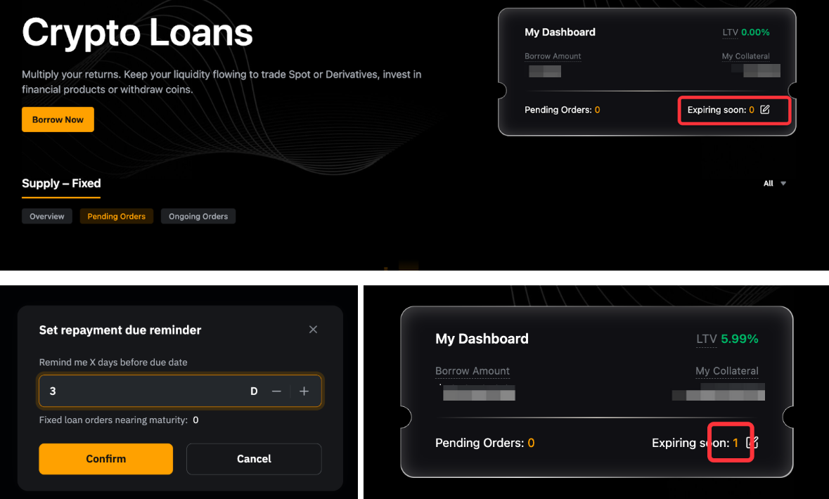 — Anda juga dapat mengaktifkan pengingat “pembayaran jatuh tempo” dengan membuka laman beranda Pinjaman Kripto dan mengeklik ikon edit di sebelah Segera Kedaluwarsa di Dasbor Saya untuk mengatur jumlah hari sebelum tanggal jatuh tempo. Setelah pelunasan jatuh tempo, jumlah produk yang kedaluwarsa akan ditampilkan di sebelah Segera Kedaluwarsa.