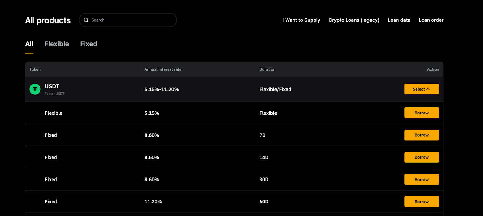 Langkah 2: Dalam Semua produk, Anda akan menemukan opsi pinjaman dengan suku bunga fleksibel dan pinjaman dengan suku bunga tetap. Pilih atau cari aset yang ingin Anda pinjam untuk melihat durasi yang tersedia dan suku bunga yang sesuai. Klik Pinjam pada opsi yang sesuai untuk Anda.