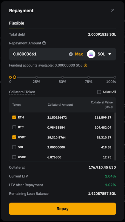 Selain itu, Anda juga dapat memilih lebih dari satu jenis jaminan untuk pelunasan. Harap meninjau detail pelunasan pada pop-up konfirmasi dan ketuk Lunasi. Akan dikenakan biaya jika Anda melunasi Pinjaman Kripto Anda menggunakan koin jaminan. Tingkat biaya adalah yang lebih tinggi antara tingkat biaya pembayaran kembali untuk aset agunan dan aset utang.