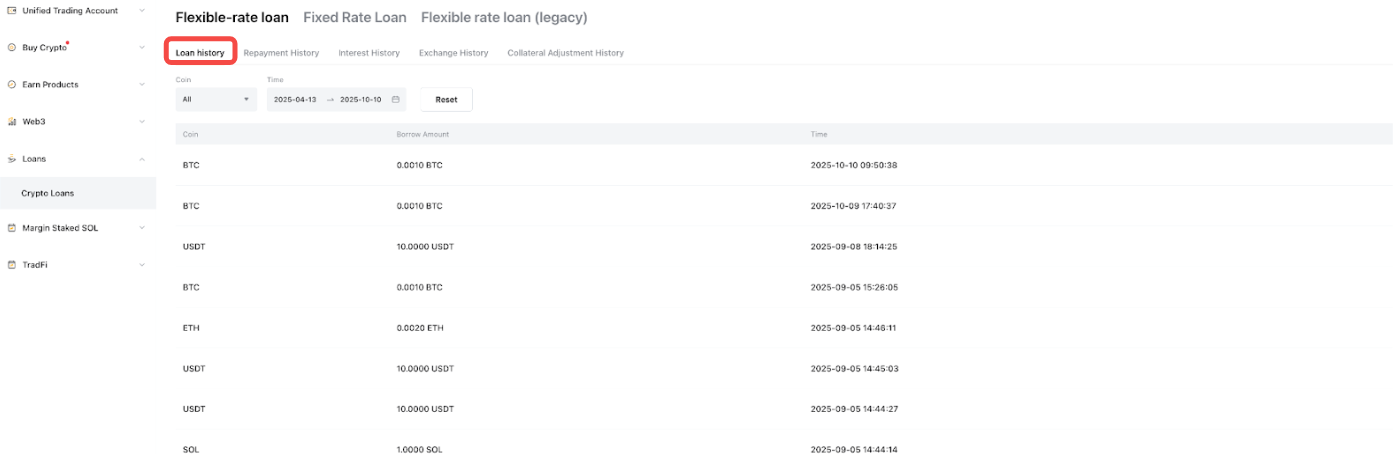 Untuk melihat daftar lengkap semua pesanan Anda, klik pesanan Pinjaman di bawah Dasbor Ikhtisar. Anda dapat melihat semua pesanan Pinjaman Kripto dengan mengalihkan tab produk di atas, termasuk Pinjaman (Tetap), dan Tarif Pinjaman Fleksibel, dengan informasi terperinci tentang pinjaman, pelunasan, bunga, jaminan, dan lainnya. Anda juga dapat memfilter berdasarkan aset atau waktu untuk memperkecil jangkauan hasil pencarian.