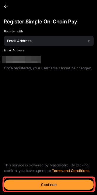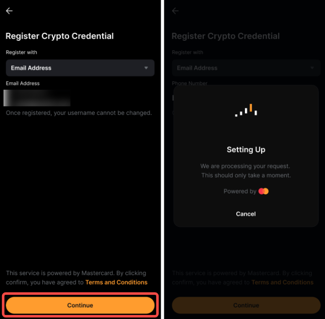 Langkah 3: Pilih Alamat Email atau Ponsel Nomor, lalu ketuk Lanjutkan untuk menyimpannya sebagai Mastercard Crypto Credential.