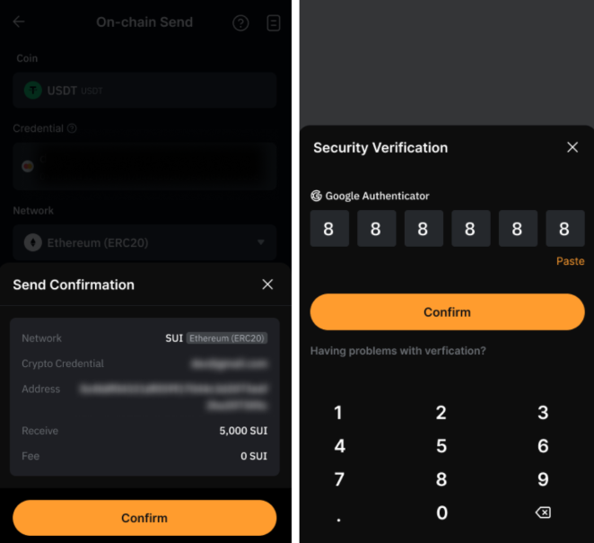 Langkah 5: Tinjau detail transaksi Anda sebelum mengetuk Konfirmasi dan masukkan kode Google Authenticator Anda untuk menyelesaikan permintaan.
