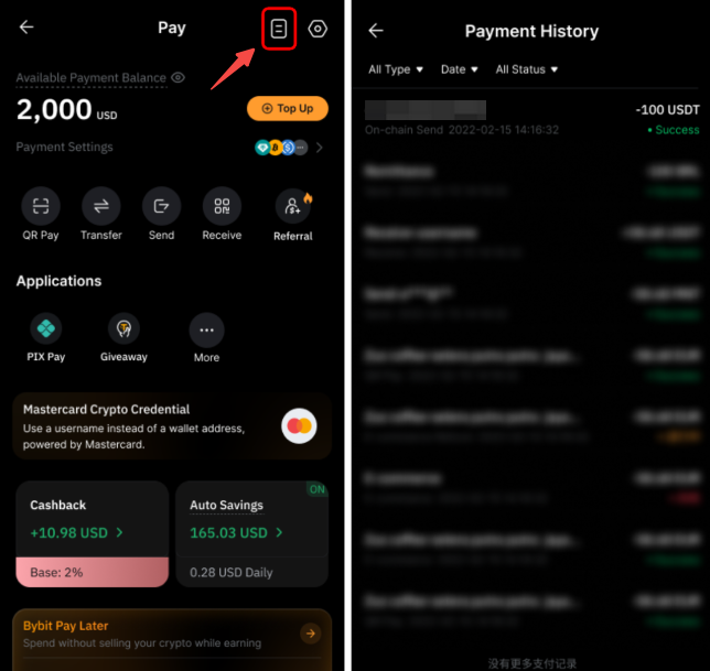 Buka halaman Bybit Pay dan ketuk ikon Riwayat Pembayaran yang terletak di sudut kanan atas.