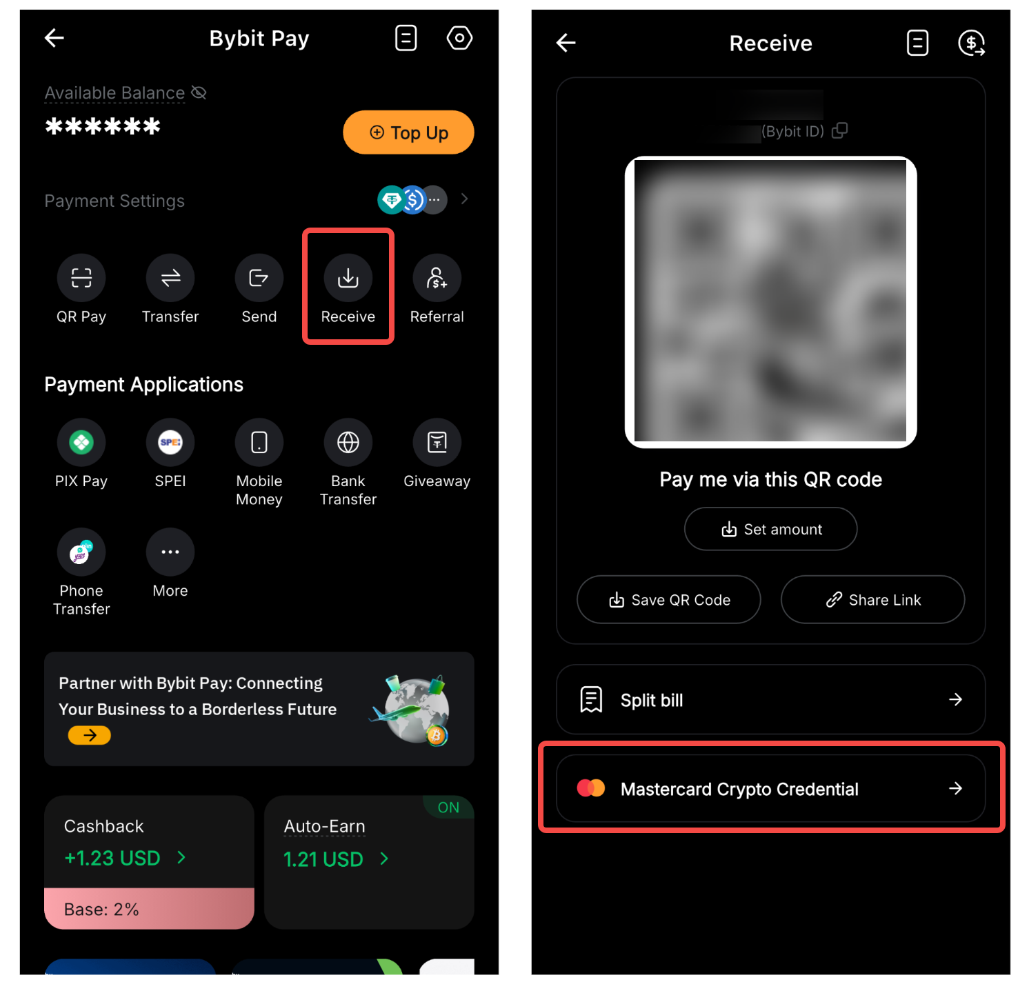 Langkah 1: Dari halaman Bybit Pay, ketuk Terima → Mastercard Crypto Credential, lalu ketuk Daftar.