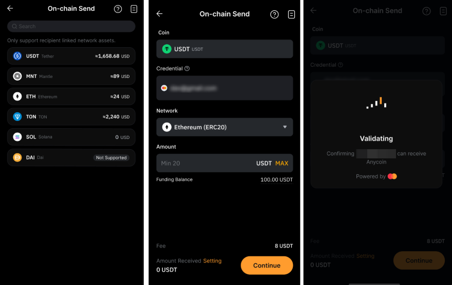 - Hanya daftar mata uang kripto dan jaringan yang didukung pada Mastercard Crypto Credential penerima Anda yang akan terlihat.