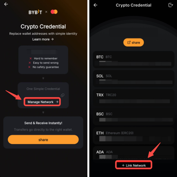Mastercard Crypto Credential adalah layanan yang menggantikan alamat dompet yang panjang dan rumit dengan alias (nama pengguna) yang sederhana dan dapat dibaca manusia. Layanan ini membantu pengguna mengirim dan menerima mata uang kripto dengan lebih mudah dan aman. Fitur ini saat ini hanya tersedia di Aplikasi Bybit.