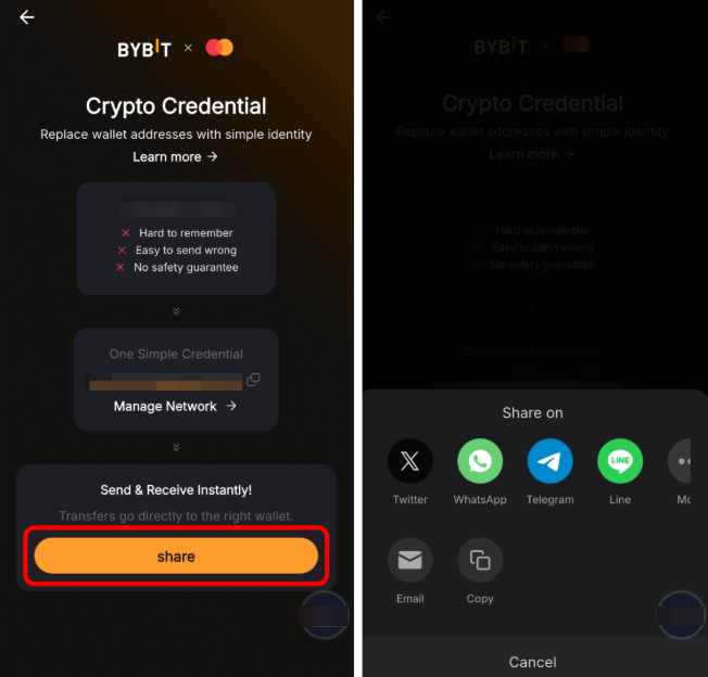 Ketuk Terima di halaman Bybit Pay, lalu ketuk Kredensial Kripto Mastercard. Ketuk Bagikan untuk membagikan permintaan penerimaan Anda di media sosial atau mengirimkannya sebagai tautan kepada pengirim.