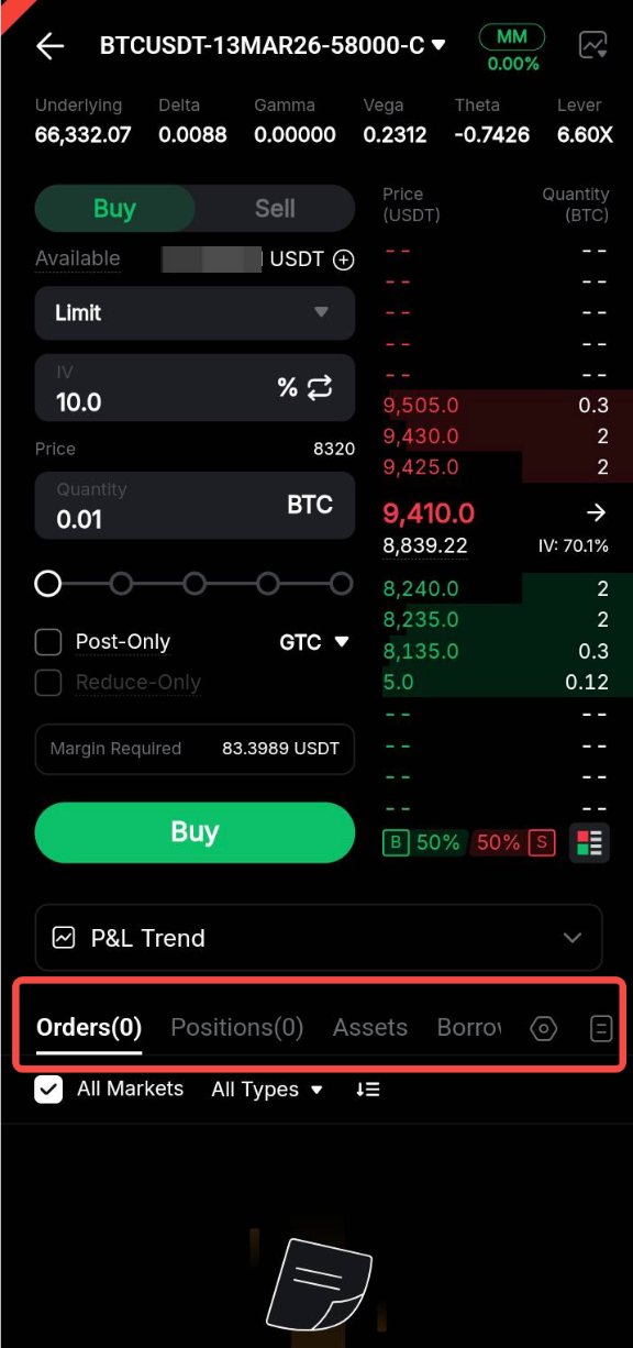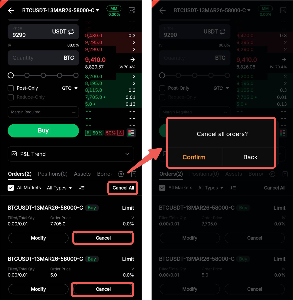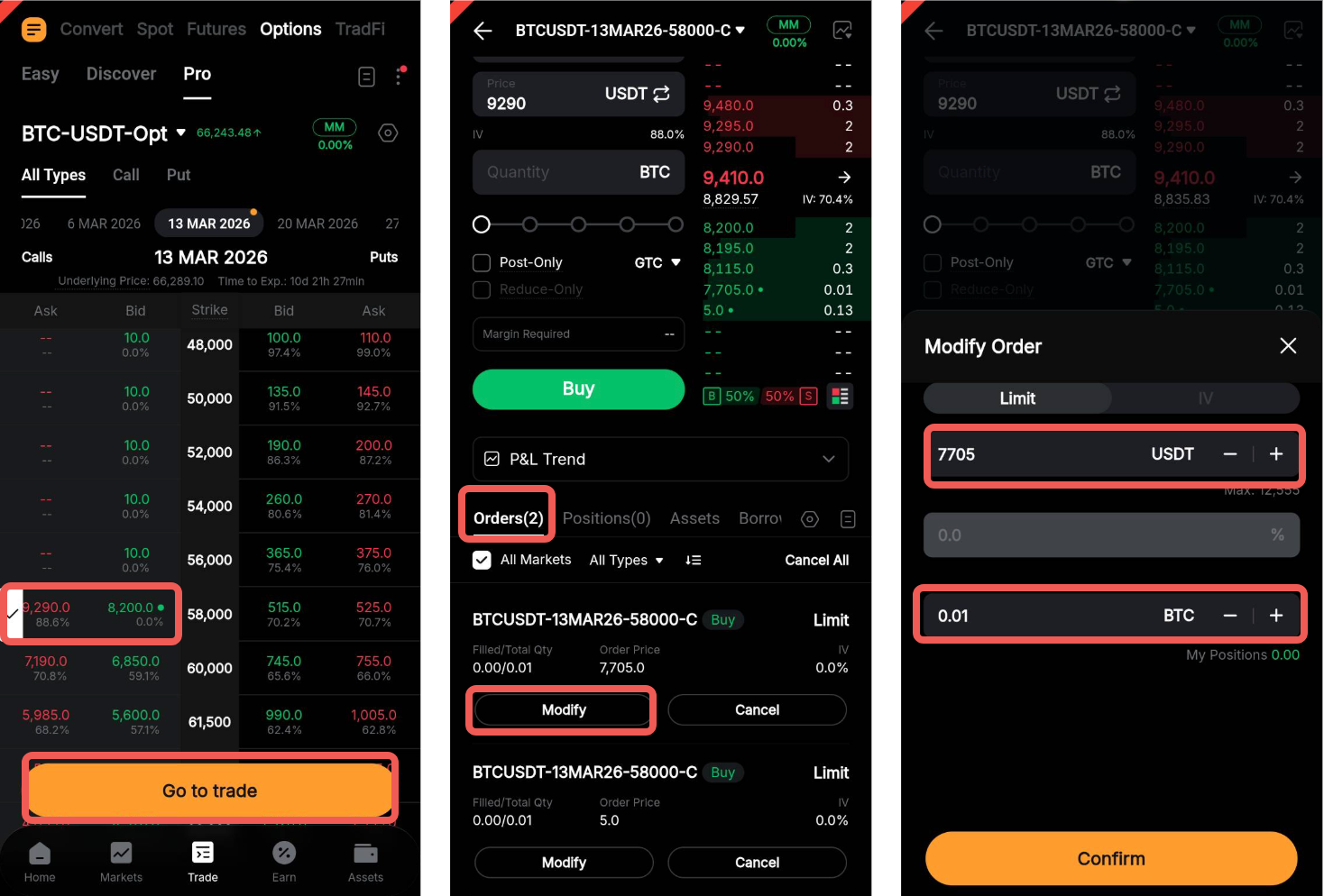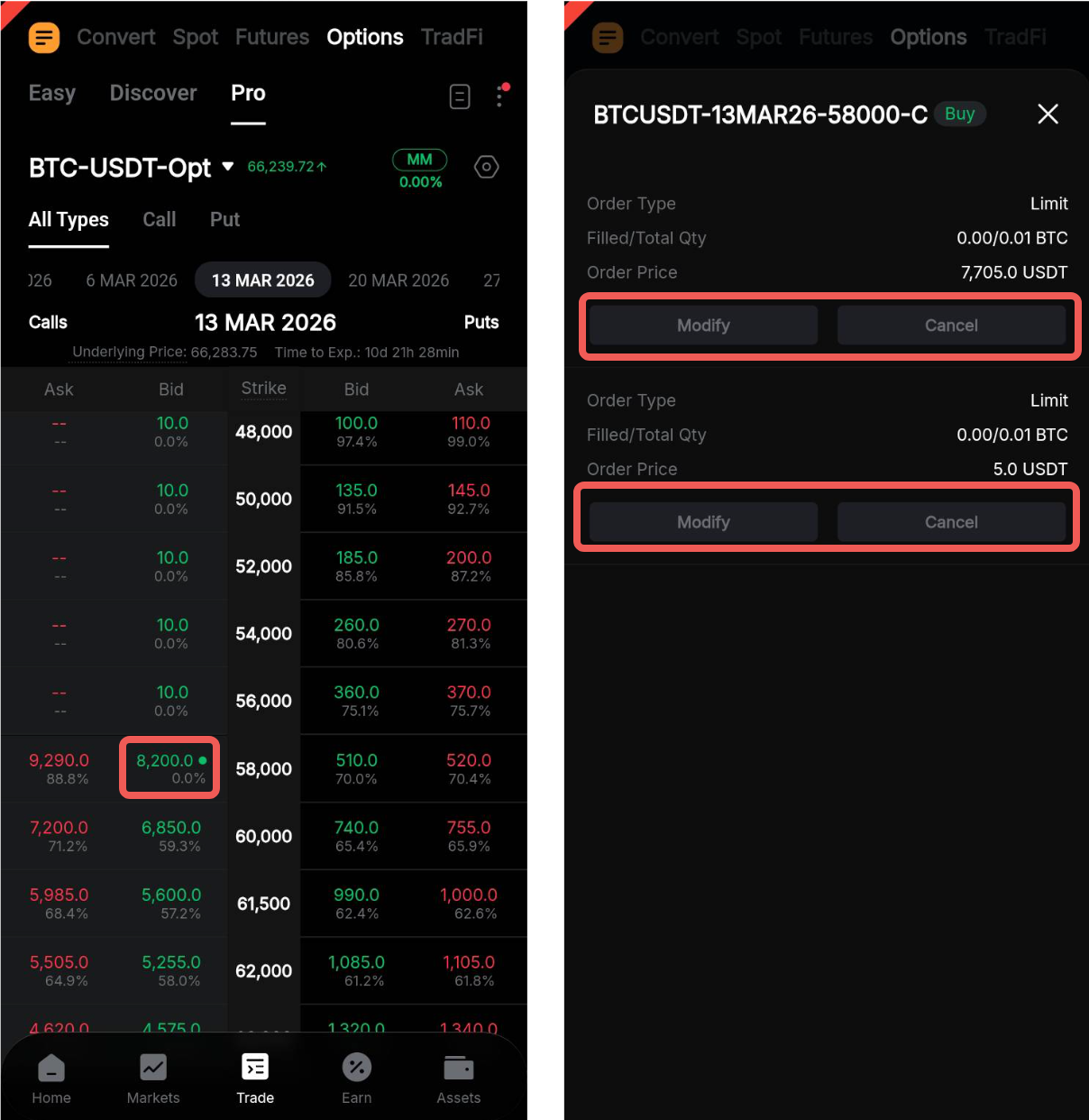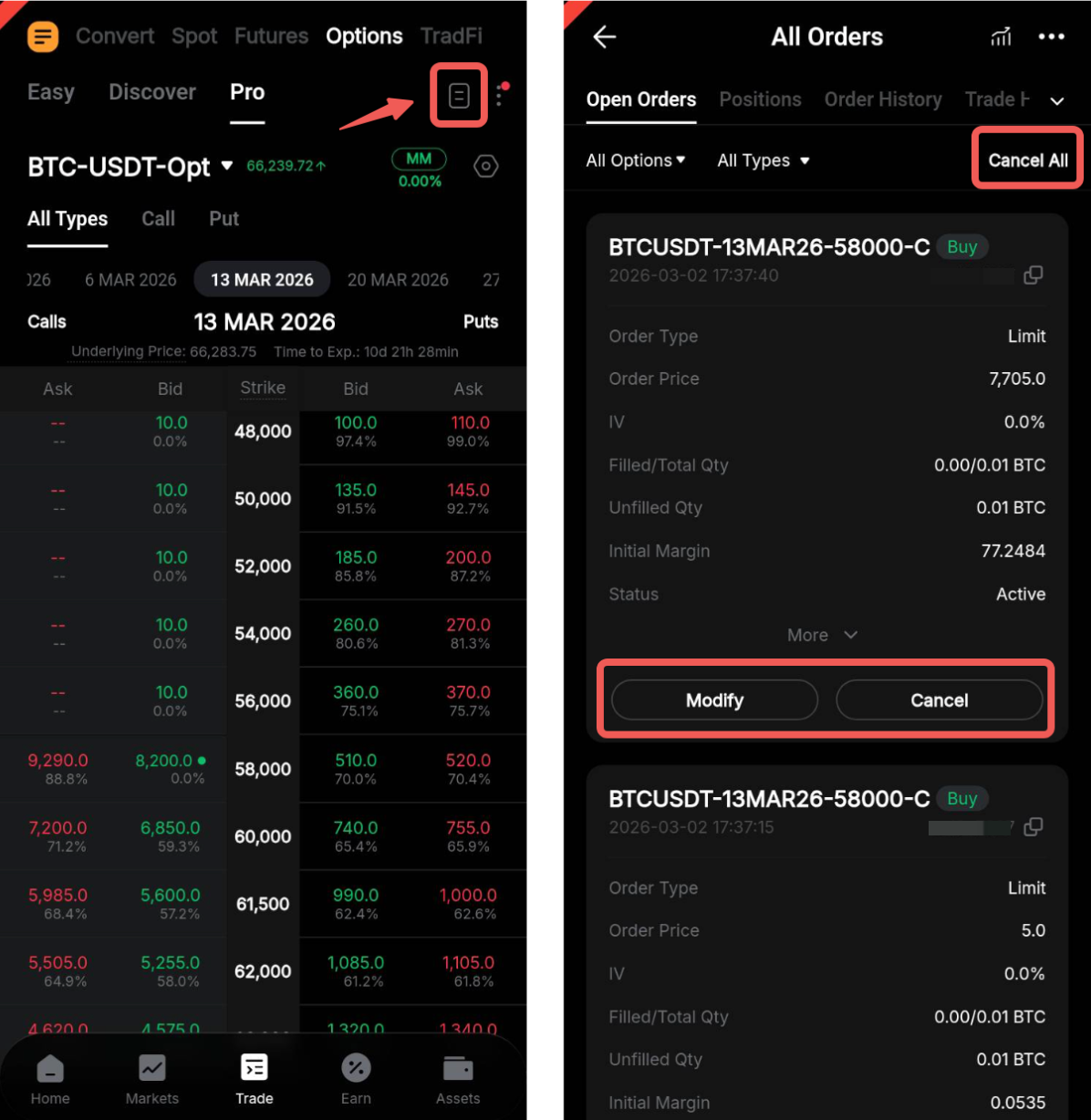 Buka tab Pesanan di Subpanel Trade. Ketuk Modifikasi untuk pesanan yang relevan guna memperbarui parameter pesanan, termasuk Harga Pesanan atau IV (%) (tergantung pada parameter yang dipilih selama penempatan pesanan), serta kuantitas kontrak.