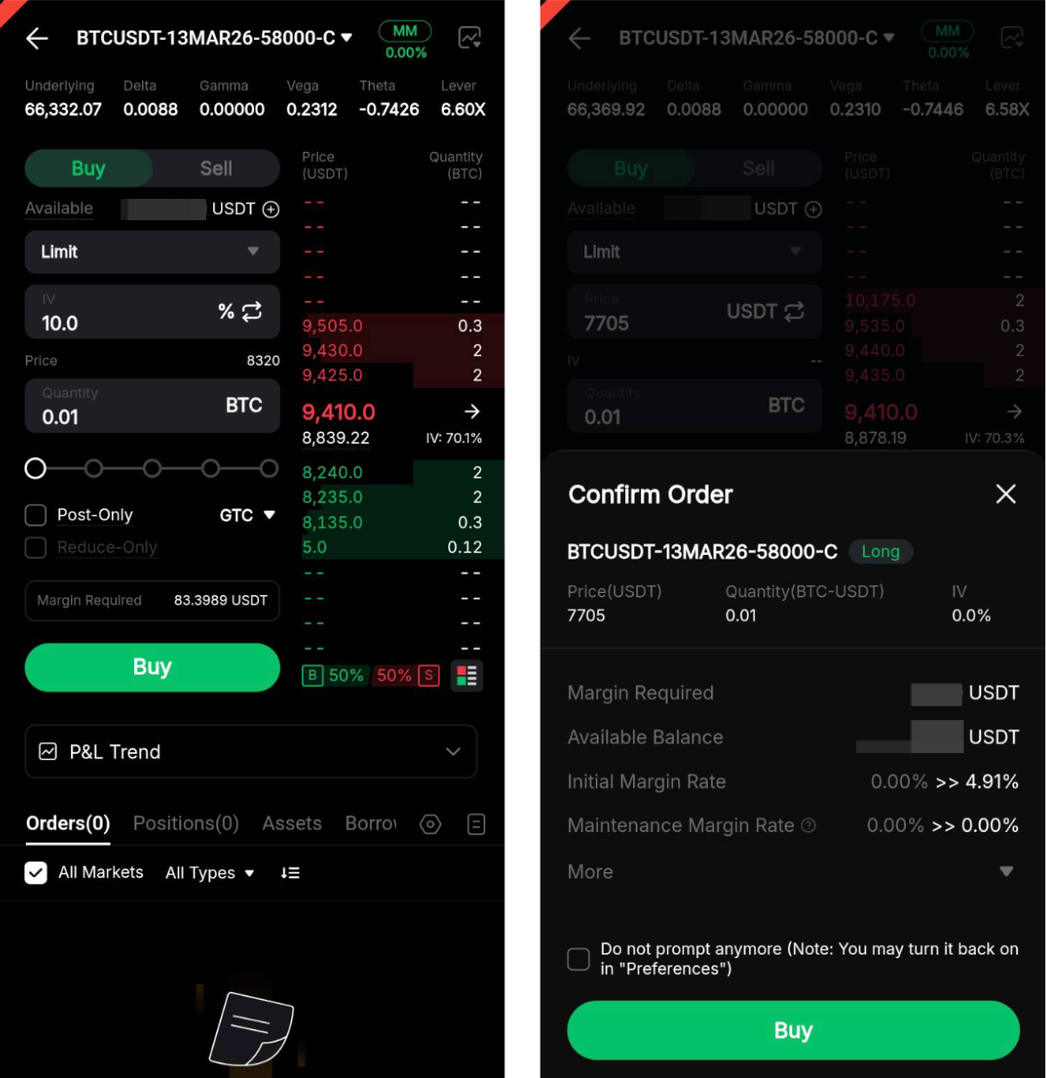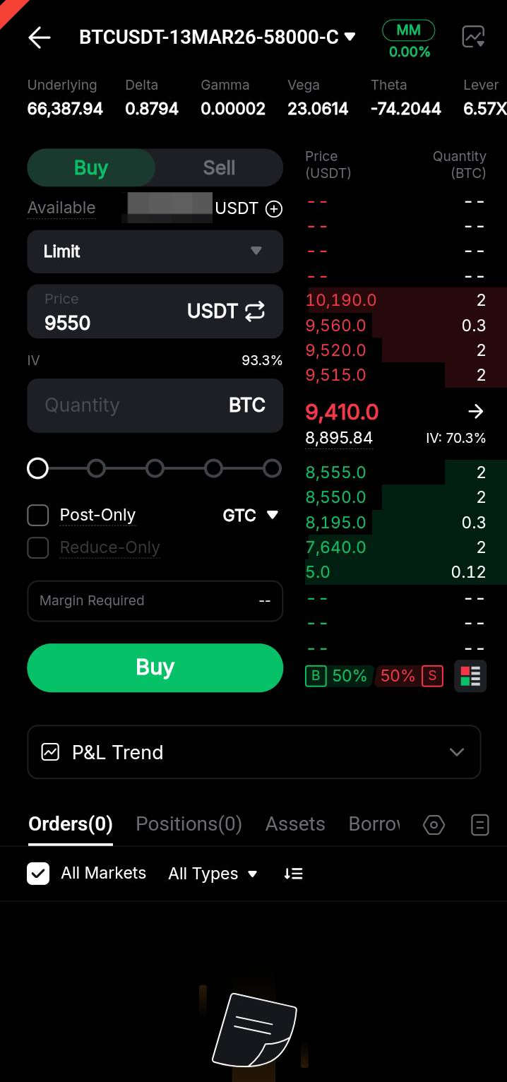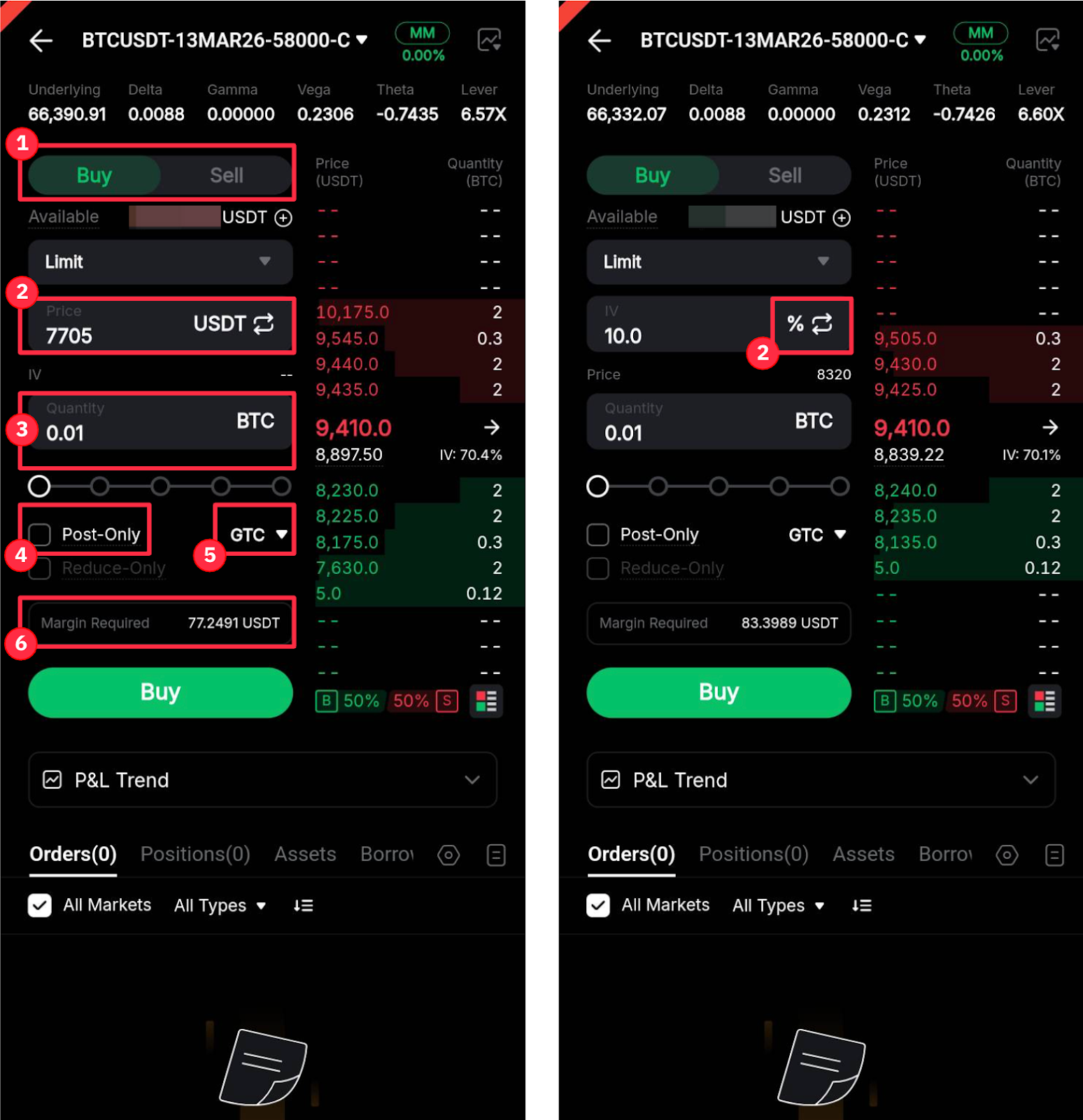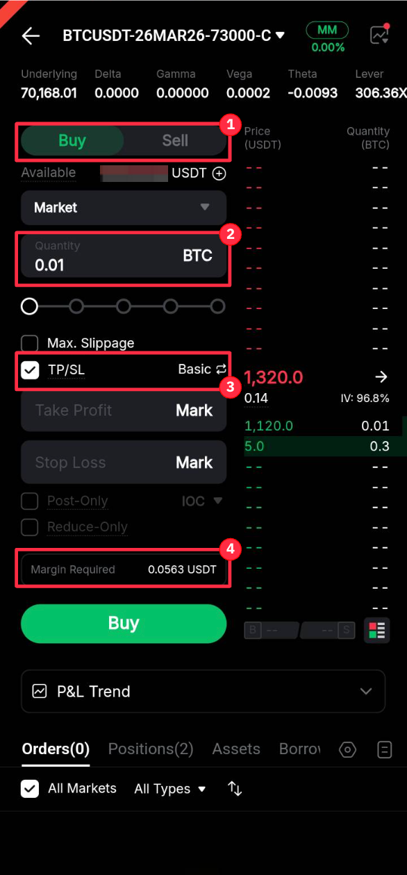 Langkah 3: Di halaman penempatan pesanan, Anda dapat melihat harga penawaran/permintaan dan detail kontrak utama, seperti Volatilitas Tersirat (IV), Delta, Gama, dan banyak lagi.
