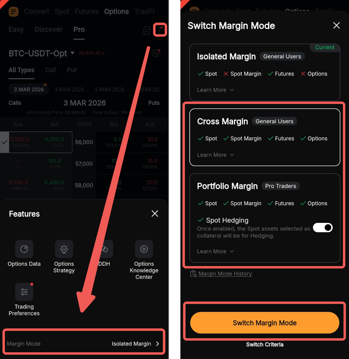 Untuk beralih ke mode margin yang didukung, buka Trade → Opsi, ketuk ikon Elipsis → Margin Terisolasi, lalu pilih mode margin yang Anda inginkan dan ketuk Beralih Mode Margin untuk mengonfirmasi.