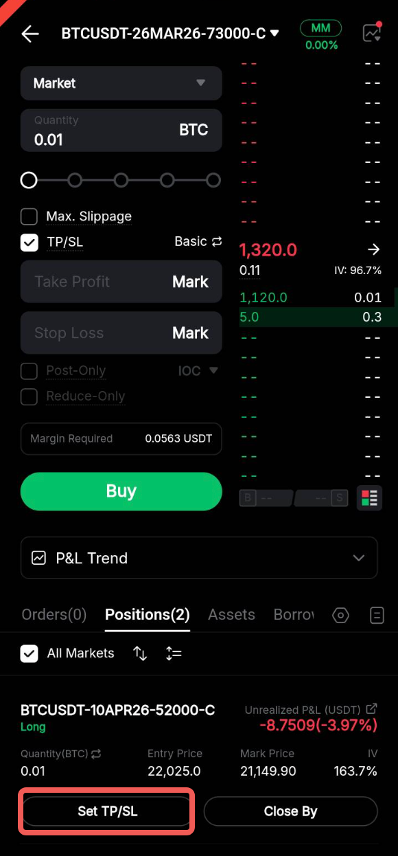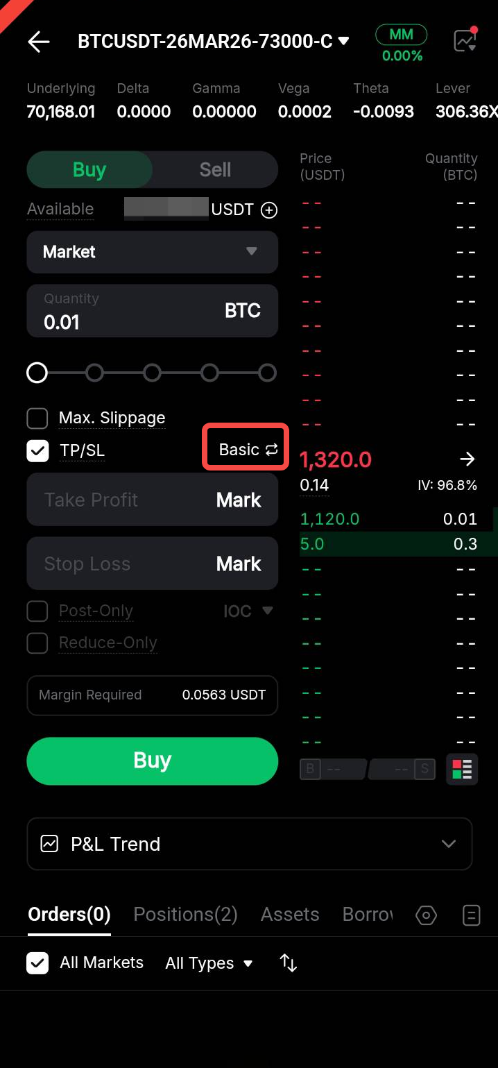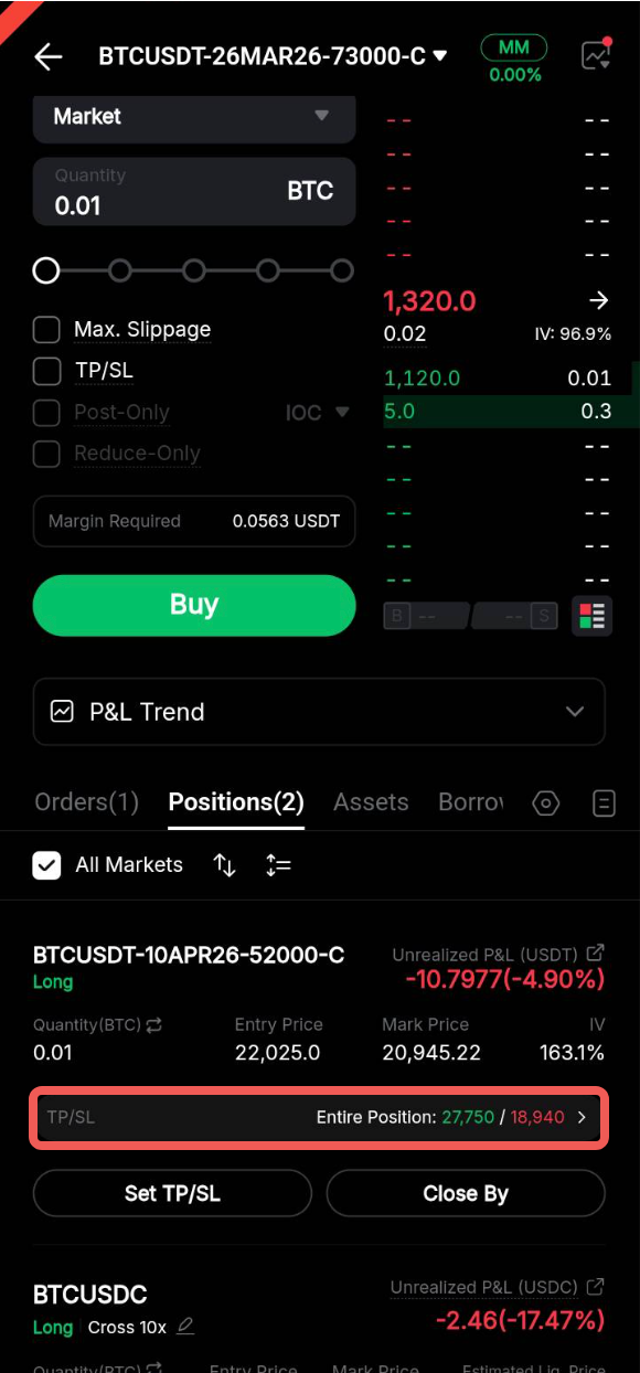 Saat ini, pesanan TP/SL untuk Opsi hanya tersedia untuk pesanan pasar dan tidak didukung untuk pesanan terbatas.