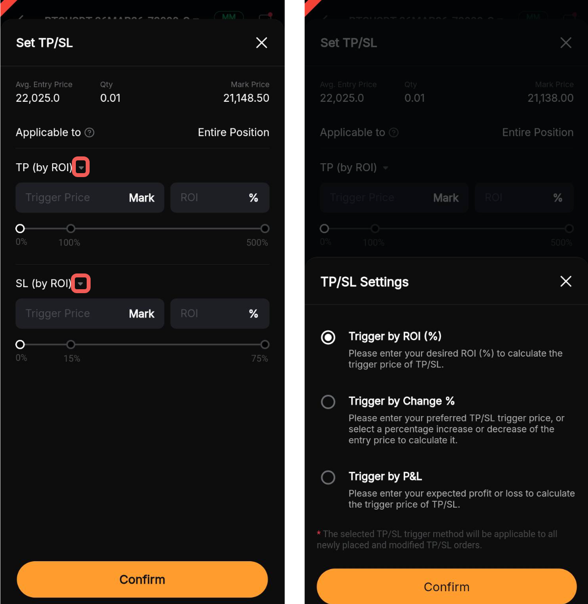 Langkah 2: Pilih mode pemicu TP/SL yang Anda inginkan: Berdasarkan ROI (%), Berdasarkan Perubahan (%), atau Berdasarkan L&R.